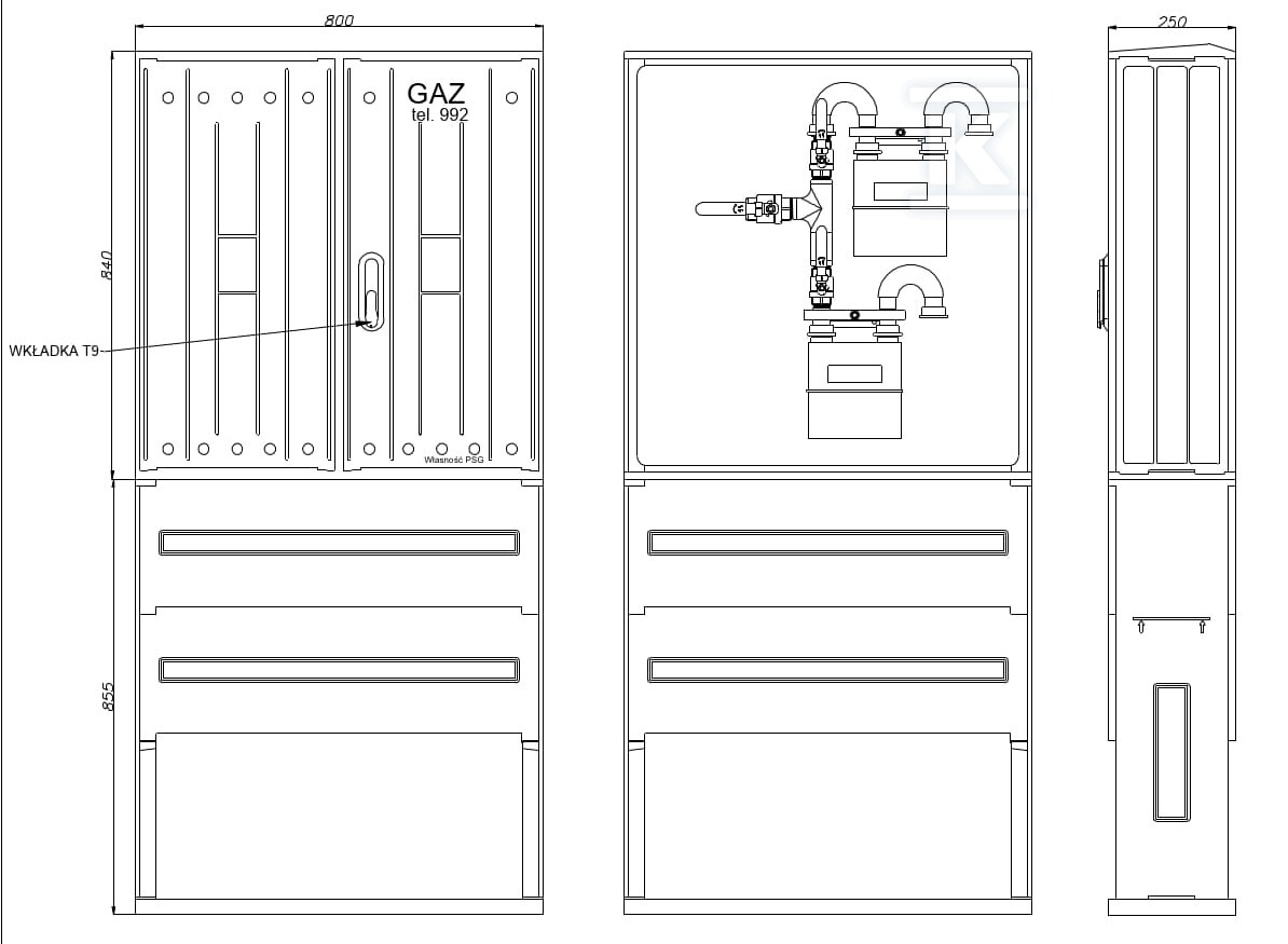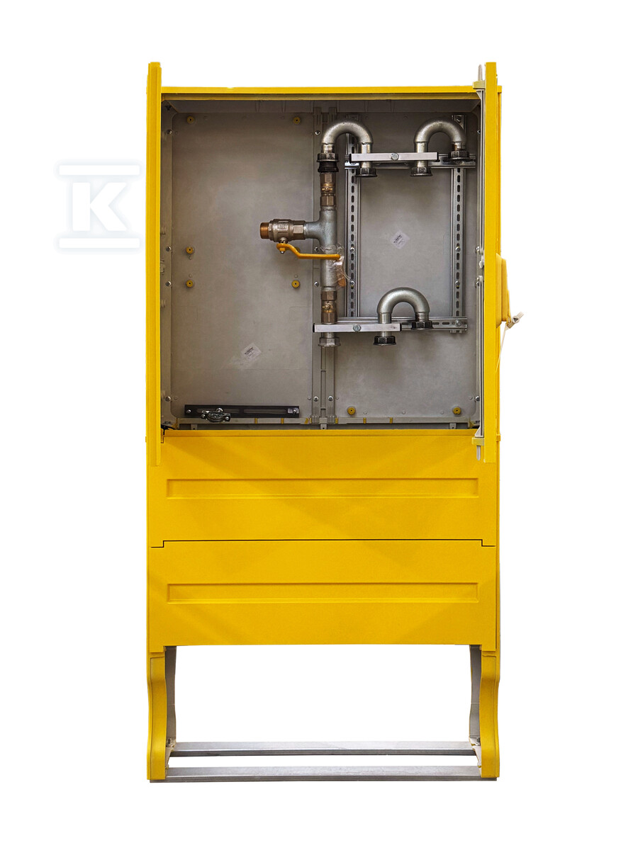 Шафа оснащена моноз'єднанням для двох газових лічильників у вертикальному положенні з клапаном 5/4" для редуктора, що полегшує монтаж та демонтаж вимірювальних приладів. Стандартне виконання в жовтому кольорі RAL 1021 забезпечує хорошу видимість та ідентифікацію шафи.