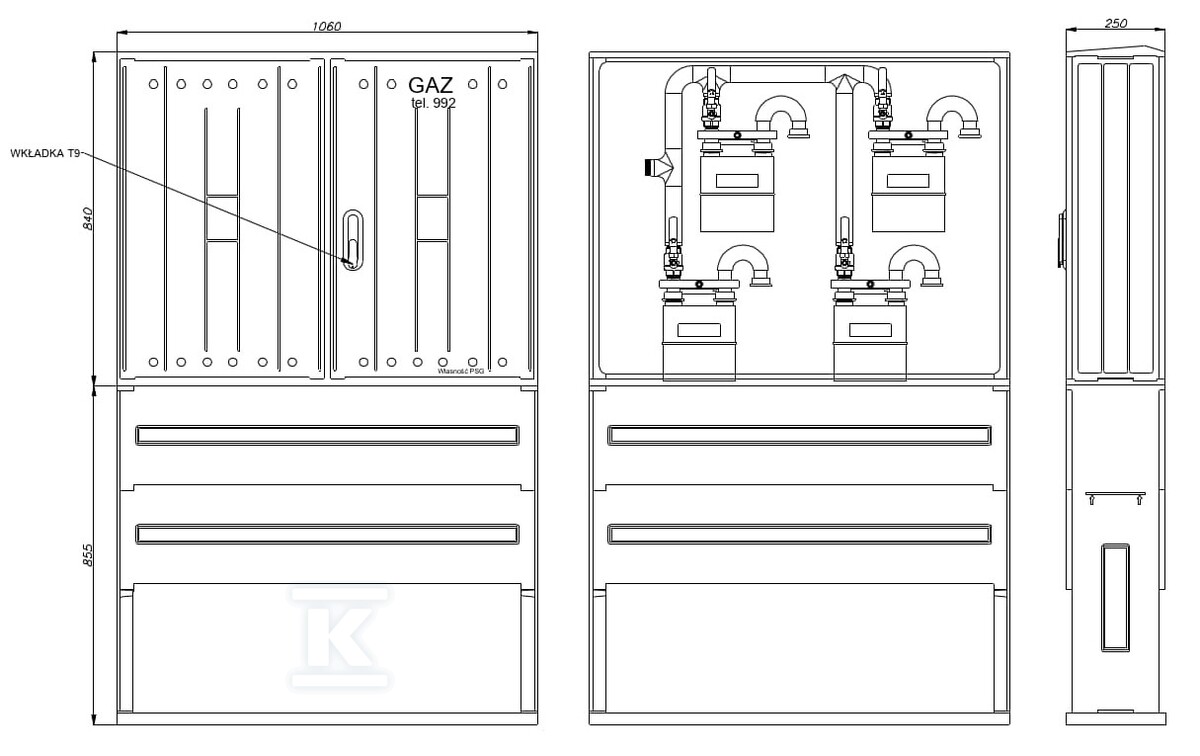 Шафа розроблена з урахуванням зручності монтажу та подальшої експлуатації. Моноз'єднання дозволяє швидке та легке підключення газових лічильників, усуваючи монтажні напруження та зменшуючи кількість різьбових з'єднань. Природна вентиляція через вентиляційні отвори забезпечує належну циркуляцію повітря всередині шафи. Універсальний замок з трикутним штифтом (9 мм) забезпечує доступ пожежним та газовим службам. На дверцятах розміщені міцні інформаційні написи: „GAZ” та „Власність PSG”. Відсутність оглядового вікна на дверцятах підвищує безпеку та ускладнює несанкціонований доступ до показників лічильника.