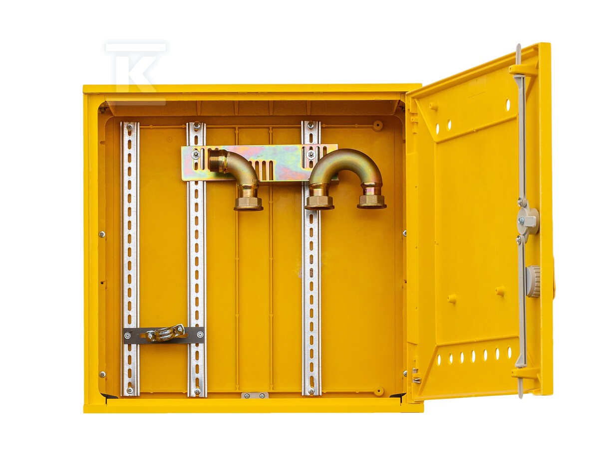 Шафа оснащена моноз'єднанням для середнього тиску, що значно полегшує та прискорює монтаж газового лічильника. Це усуває необхідність точного підбору осі розстановки та зменшує кількість різьбових з'єднань – заощаджуючи час монтажникам. Дверцята шафи вбудовані в корпус, що захищає внутрішній простір від впливу атмосферних умов та несанкціонованого доступу. Універсальний замок забезпечує легкий доступ рятувальним службам у разі потреби. Відсутність оглядового вікна усуває потенційні проблеми, пов'язані з читанням лічильника газу сторонніми особами.