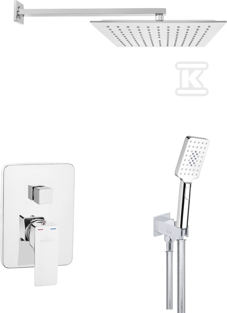 Серцем набору є вбудований змішувач 2-функціональний, який дозволяє зручно перемикати струмені води. У наборі також є квадратна верхня душова лійка розміром 25 x 25 см, виготовлена з високоякісного ABS, оснащена системою anti-calc – запобігає утворенню накипу та полегшує очищення. Крім того, набір містить душове кріплення довжиною 40 см, що забезпечує оптимальний кут падіння води.