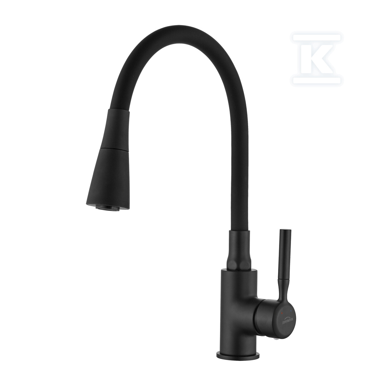 Змішувач для кухні Pogo Plus у чорному виконанні – це ідеальне рішення для тих, хто цінує як естетику, так і практичні рішення. Однорідний колір без хромованих додатків надає кухні сучасного характеру, а продумана конструкція полегшує повсякденне використання. Це пропозиція для людей, які шукають змішувач, який буде не тільки функціональним, але й елементом декору.