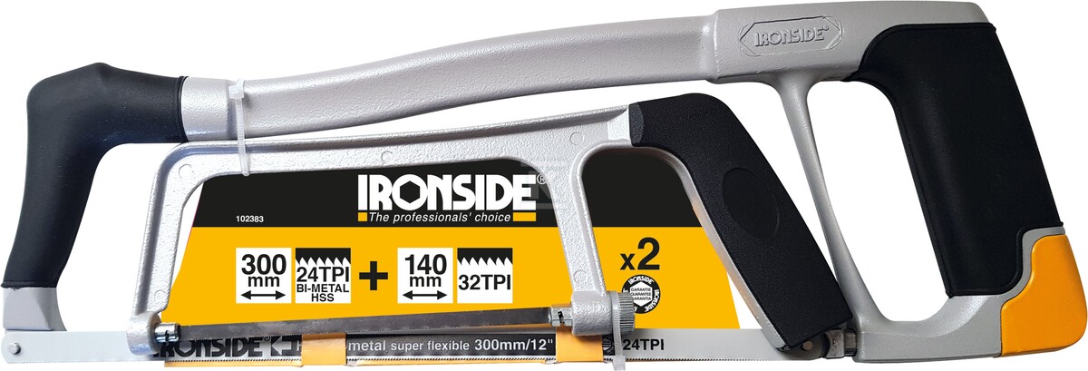 У комплект ножівки Ironside входять дві пилки з легкою і міцною алюмінієвою рамою. Пили мають м'які та ергономічні ручки. Довжина леза 300 мм і 150 мм. Ножівки зручно переносити, оскільки вони мають легку та міцну алюмінієву раму, а також м’які та ергономічні ручки. Пилки по металу підходять для різання різних металів. Більша ножівка Ironside також має опору для передньої руки, що дозволяє легко пиляти обома руками. Ножівки мають гнучке металеве BI полотно, натяг якого легко регулюється. Маленька ножівка підходить для пиляння, що вимагає особливої точності. Технічні характеристики: