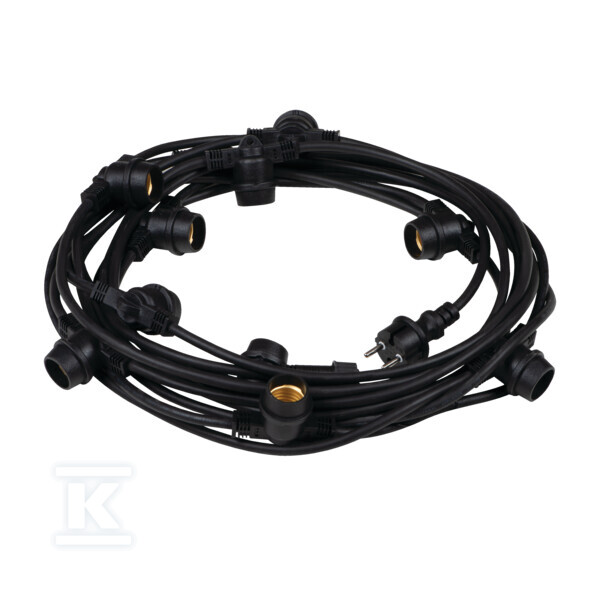 Гірлянда складається з 10 оправ, кожна з яких пристосована для лампочки потужністю до 10W. Провід виготовлений з міцного матеріалу H07RN-F перерізом 1,5 мм² забезпечує безпечну та надійну роботу. Провід, закінчений вилкою, полегшує підключення до мережі (220-240V AC, 50Hz). Можливість послідовного з'єднання оправ дозволяє створювати довші світлові ланцюги. Клас захисту II гарантує додаткову безпеку використання.