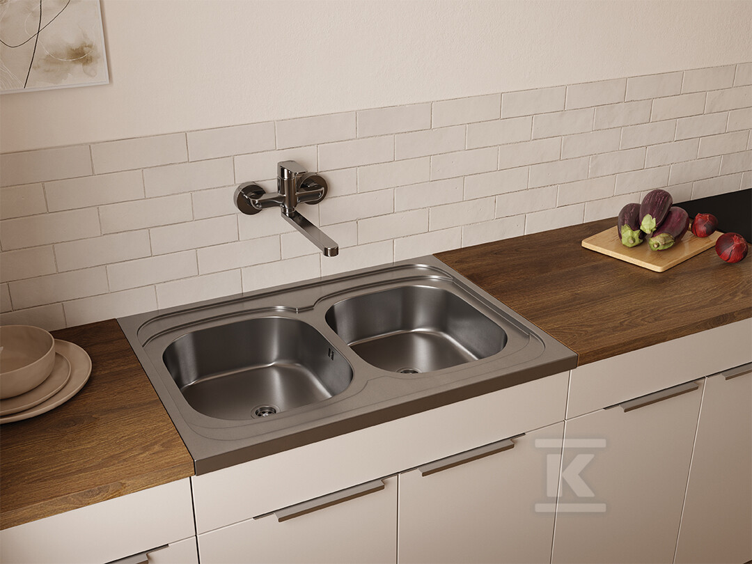 Ця двокамерна мийка з нержавіючої сталі є практичним рішенням для будь-якої кухні, особливо там, де важливе ефективне використання простору. Вона підійде як для невеликих блоків, так і для більших приміщень. Її розміри – 60x80 см – дозволяють зручно мити навіть великий посуд та каструлі. Конструкція, що накладається, полегшує монтаж та адаптацію до існуючої шафи шириною 80 см.