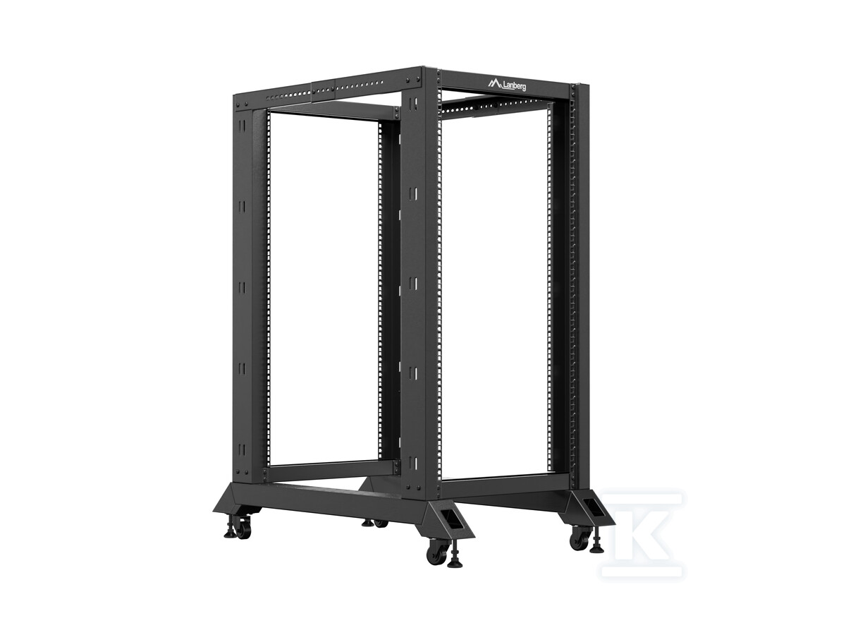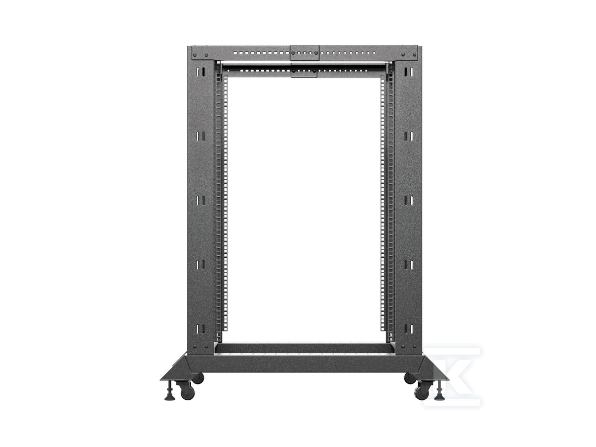 Виготовлений з високоякісної холоднокатаної сталі товщиною 1.5 мм, стійкий характеризується винятковою міцністю та стійкістю до пошкоджень. Посилена рама та міцні монтажні рейки гарантують безпеку зберіганого обладнання. Максимальне статичне навантаження, що становить аж 600 кг, дозволяє встановлювати навіть важке обладнання без побоювання втрати стабільності. У комплекті є коліщатка з гальмом, ніжки та набір монтажних гвинтів M6, що полегшує транспортування та встановлення стійки. Все поставляється у формі Flat Pack – розкладеним на плоскій поверхні – що полегшує транспортування та зберігання перед монтажем.