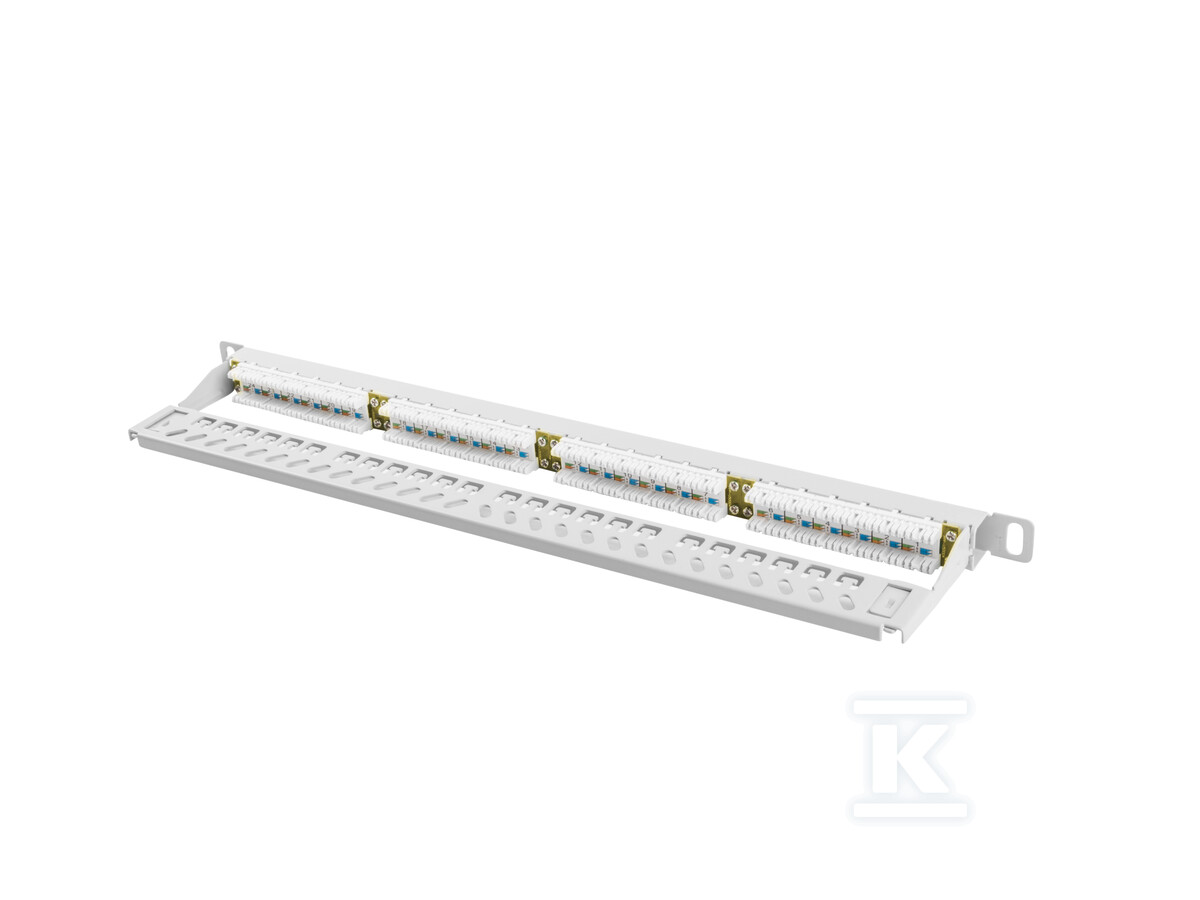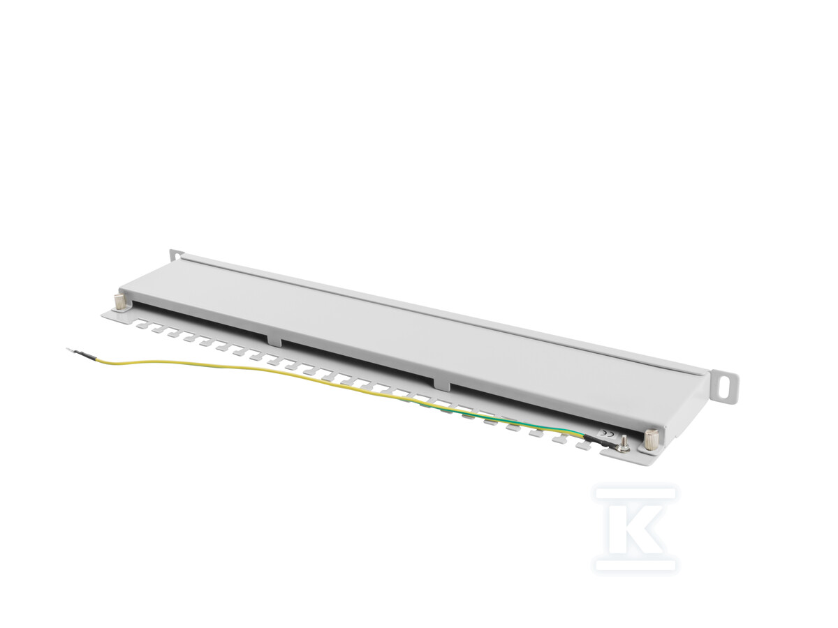 Патч-панель виготовлена з металу та пофарбована в сірий колір RAL7035, що забезпечує естетичний вигляд і хорошу видимість у слабо освітлених приміщеннях. Його розміри (99.5 мм довжини, 445 мм ширини та 22.23 мм висоти) дозволяють легко інтегрувати його з більшістю стандартних шаф rack 19". Вага пристрою становить 1.16 кг, що свідчить про його міцну конструкцію. Він також має заземлення для додаткової безпеки та захисту від перешкод.