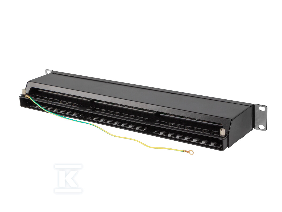 Патч-панель відповідає стандартам T568A і T568B, що забезпечує сумісність з більшістю мережевих пристроїв. Пристосований до роботи в температурі від 0 до 40°C, може бути використаний в різних умовах навколишнього середовища. Заземлення панелі підвищує безпеку використання та захищає від перенапруг. Довговічність щілинного з'єднання гарантує до 200 циклів підключення та відключення, що перекладається на тривалий термін служби пристрою. Колір чорний (RAL9004) робить панель естетично вписується в оточення серверної або пункту розподілу.