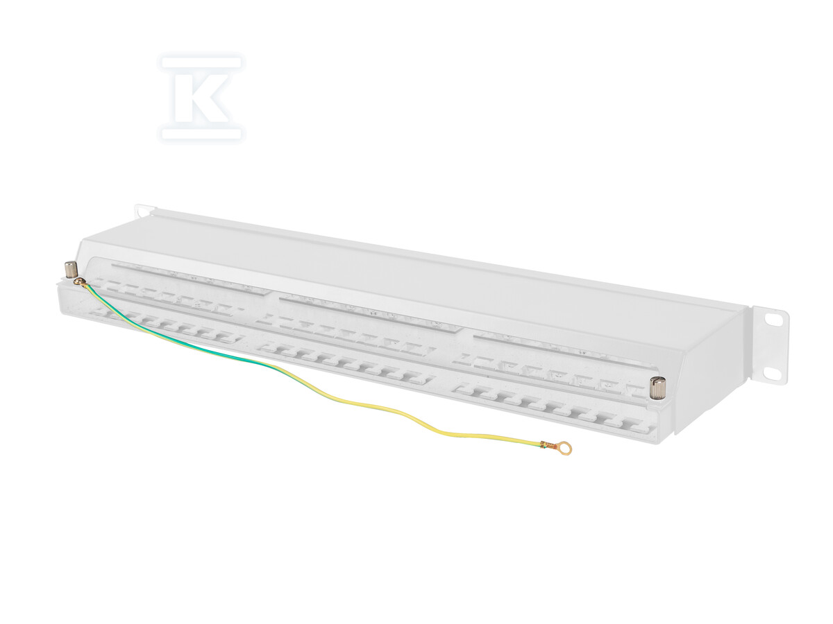 Патч-панель виготовлена з міцної сталі, пофарбованої порошковим покриттям у сірий колір RAL7035, що гарантує естетичний вигляд і стійкість до пошкоджень. Компактна висота 1U дозволяє економити місце в стійці. Роз'єми IDC/LSA дозволяють швидко та легко монтувати дроти відповідно до стандартів T568A та T568B. Додатково, панель оснащена вбудованою полицею для кабелів, яка полегшує організацію дротів і запобігає їх заплутуванню. Заземлення забезпечує додаткову безпеку інсталяції.