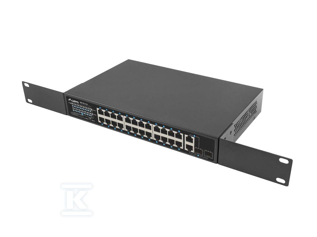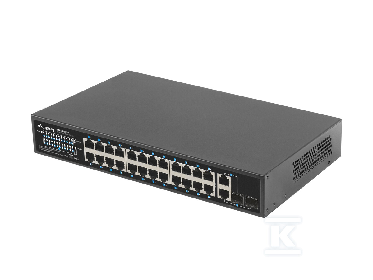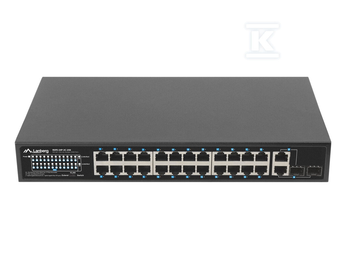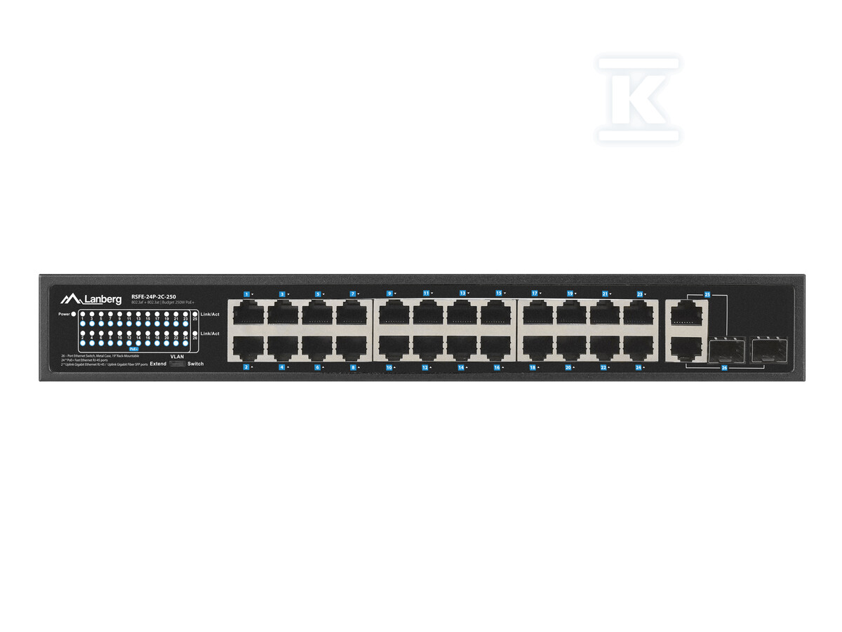 Цей 26-портовий мережевий комутатор Lanberg RSFE-24P-2C-250 є надійним рішенням для систем, які потребують живлення пристроїв через мережу Ethernet (PoE/PoE+). Він підійде для будинків, офісів, систем відеоспостереження, контролю доступу, сигналізації та пожежної безпеки. Дозволяє одночасно передавати дані та забезпечувати живлення, усуваючи необхідність використання окремих кабелів живлення та спрощуючи інсталяцію. Забезпечує загальну вихідну потужність PoE до 250 Вт, що дозволяє підключити до 16 пристроїв стандарту IEEE 802.3af або 8 пристроїв IEEE 802.3at.
