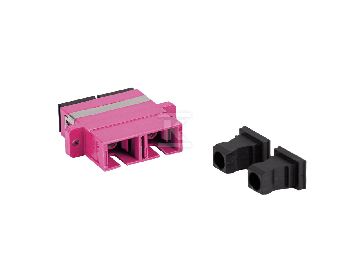 Адаптер характеризується типом з'єднання SC, загальноприйнятим стандартом в оптоволоконних мережах. Використовує багатомодове волокно OM4, ідеальне для передачі на короткі та середні відстані з високою пропускною здатністю. Його фіолетовий колір полегшує ідентифікацію в інсталяції, а широкий діапазон робочих температур від -40°C до 85°C дозволяє застосування в різних умовах навколишнього середовища. У комплекті є чорна заглушка, що захищає порт від забруднення та пошкоджень, коли він не використовується.