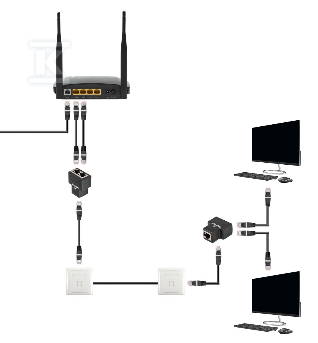 Цей адаптер, також відомий як сплітер RJ45, дозволяє підключити два пристрої до одного мережевого порту RJ45. Це просте рішення, яке дозволяє уникнути необхідності використання додаткових мережевих комутаторів у ситуаціях, коли не потрібна повна пропускна здатність для кожного пристрою. Однак слід пам'ятати, що через спосіб роботи адаптера, одночасно може працювати лише один з підключених пристроїв.