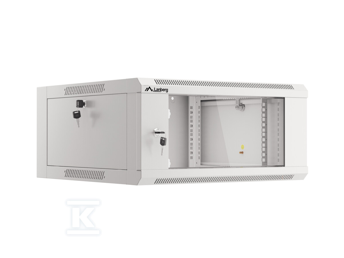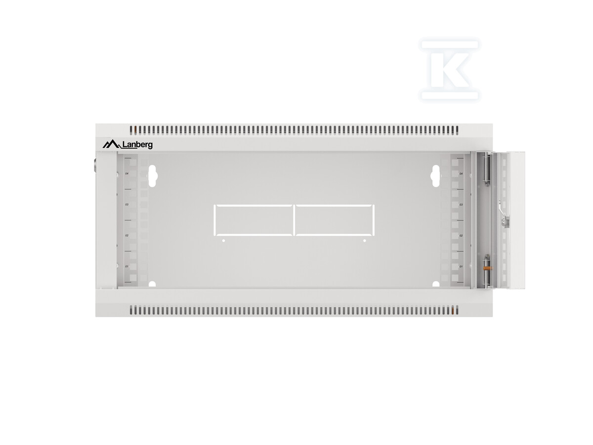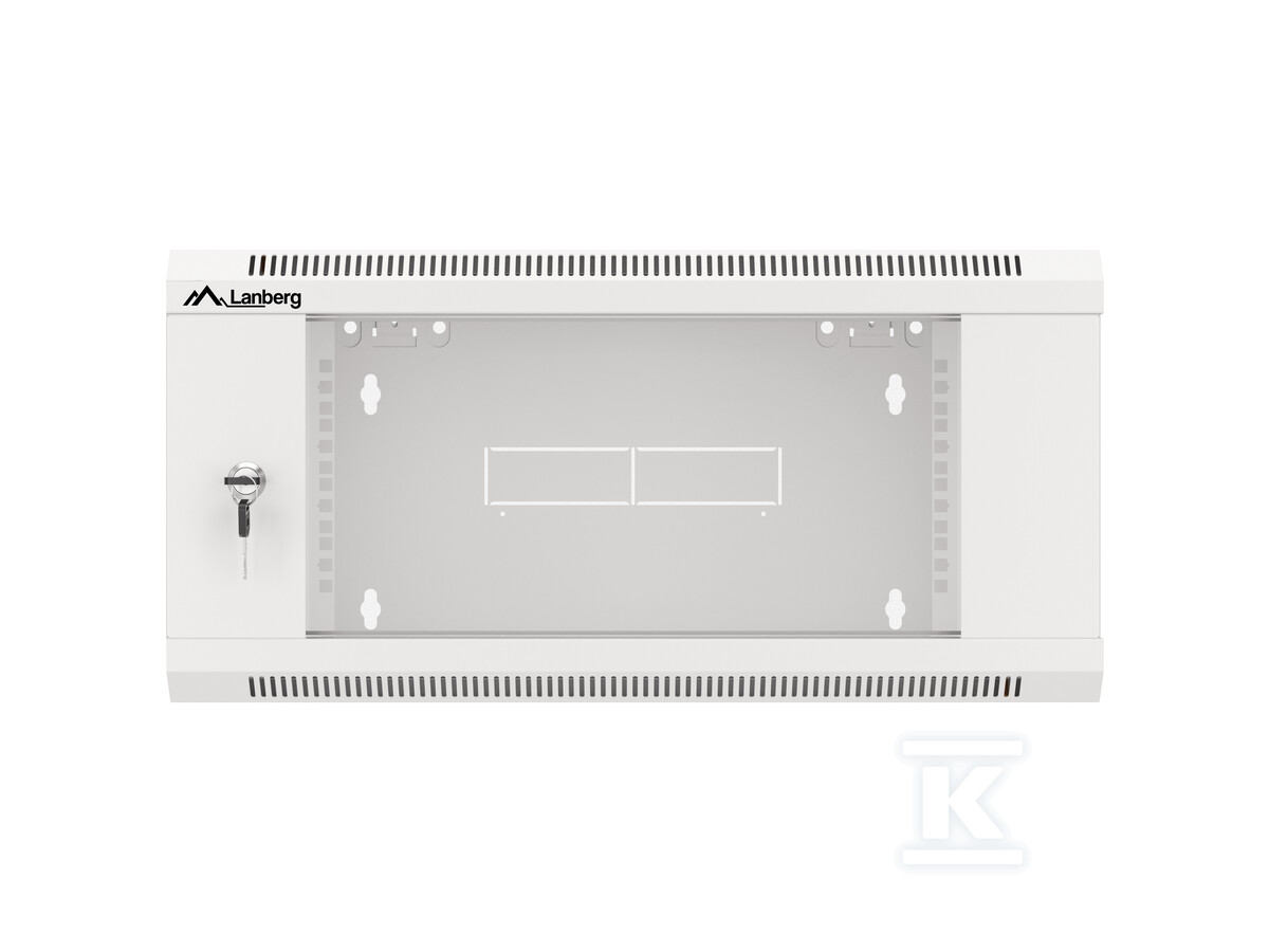 Варто звернути увагу на ефективне охолодження, забезпечене чотирма вентиляційними отворами в нижній та верхній панелях. Це забезпечує вільний потік повітря та запобігає перегріву обладнання. Шафа також має три виламувані кабельні входи, розташовані ззаду, а також зверху та знизу, що полегшує прокладку структурованого та живильного кабелю. До кожного комплекту додається монтажна планка та рівень з магнітом, що значно полегшує встановлення.