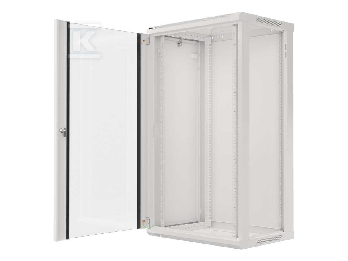 Шафа розроблена з урахуванням легкості монтажу та використання. Виготовлена з міцної сталі, що прокатується в холодному стані, гарантує стабільність і безпеку для встановленого обладнання. Засклені, одностулкові передні двері забезпечують зручний доступ до пристроїв та можливість швидкого візуального контролю стану інсталяції. Два вентиляційні отвори в стельовій панелі сприяють циркуляції повітря, що перекладається на ефективне охолодження компонентів. Чотири вертикальні монтажні рейки дозволяють гнучко розміщувати пристрої 19". Максимальне статичне навантаження шафи становить 60 кг.