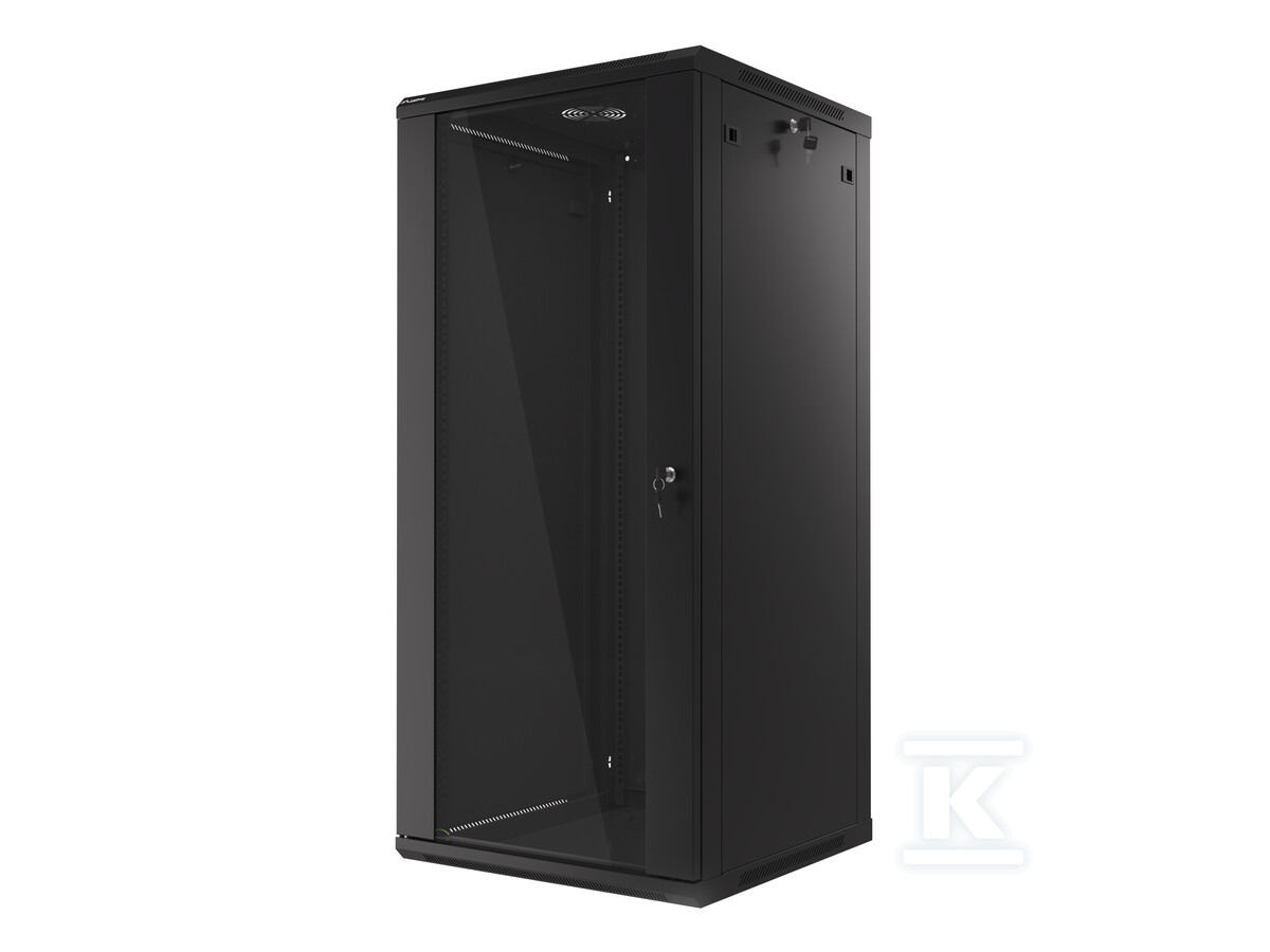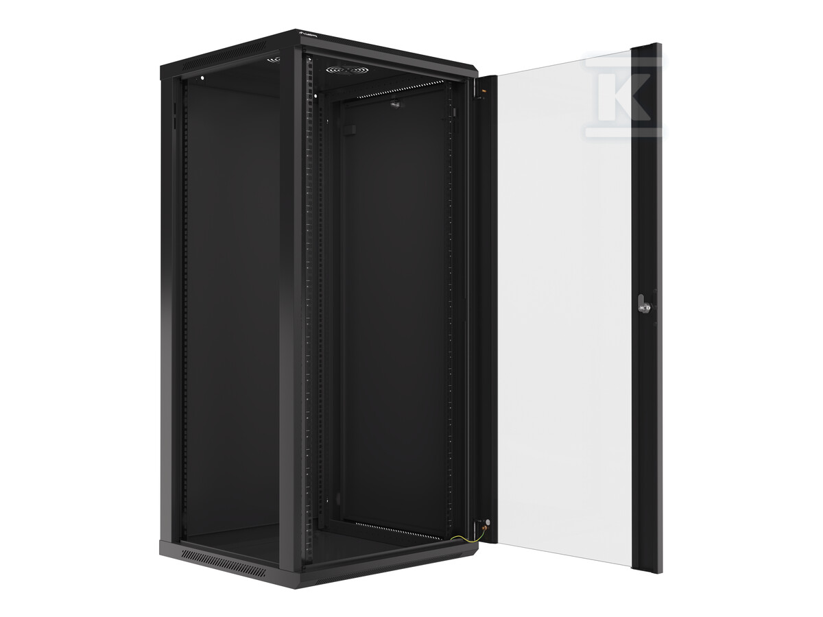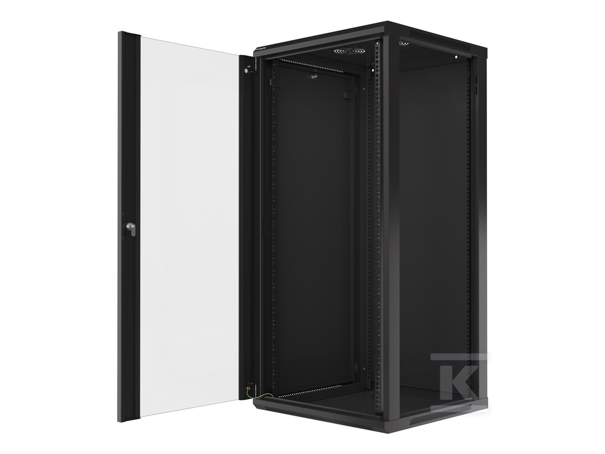 Шафа виготовлена з високоякісної холоднокатаної сталі, що забезпечує її міцність та стійкість до пошкоджень. Двері з загартованого скла дозволяють швидко ідентифікувати вміст без необхідності відкривання шафи. Використання конструкції "flat pack" полегшує транспортування та самостійний монтаж, заощаджуючи час та кошти. Завдяки стандартній висоті 27U шафа сумісна з більшістю пристроїв rack 19". Додатково, шафа має вентиляційні отвори, що забезпечують належну циркуляцію повітря та охолодження обладнання. Комплект містить всі необхідні аксесуари для монтажу, включаючи гвинти M6, монтажні кронштейни та бічні замки.