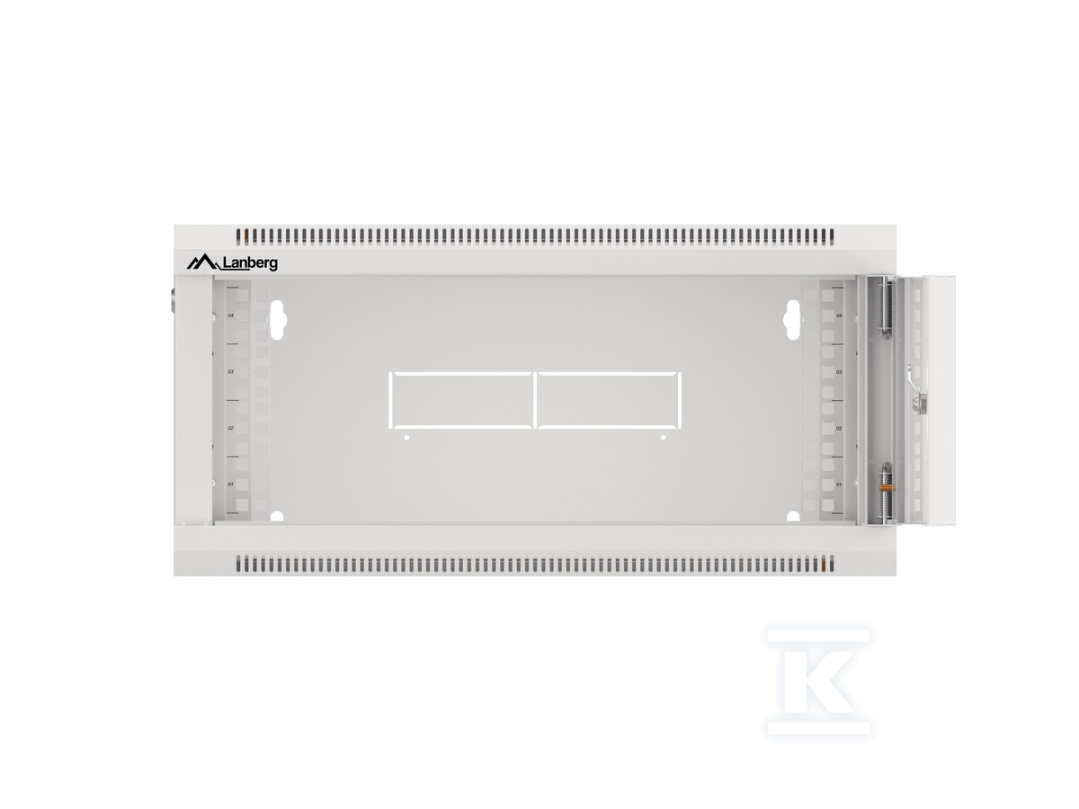 Шафа оснащена скляними передніми дверцятами із загартованого скла та сталевими бічними панелями без защіпок. Чотири вентиляційні отвори в нижній та верхній панелях забезпечують ефективний потік повітря та охолодження, що особливо важливо при інтенсивній експлуатації обладнання. Крім того, шафа має три виламувані кабельні входи (230 x 45 мм), розташовані на задній кромці верхньої та нижньої панелей, а також посередині задньої кришки – для гнучкого прокладання кабелів. У комплекті також є плоска планка для настінного монтажу та рівень з магнітом для полегшення встановлення. Максимальна робоча/монтажна глибина становить 411 мм з можливістю регулювання у 5 положеннях по 20 мм спереду та ззаду.