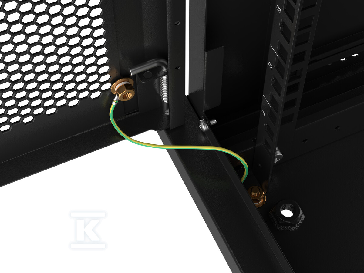 Додатково, в комплекті є всі необхідні монтажні елементи: гвинти M6, монтажний кронштейн, бічні та передні замки та кабель заземлення. Заземлення забезпечується через передні двері та нижню панель, що підвищує безпеку використання.