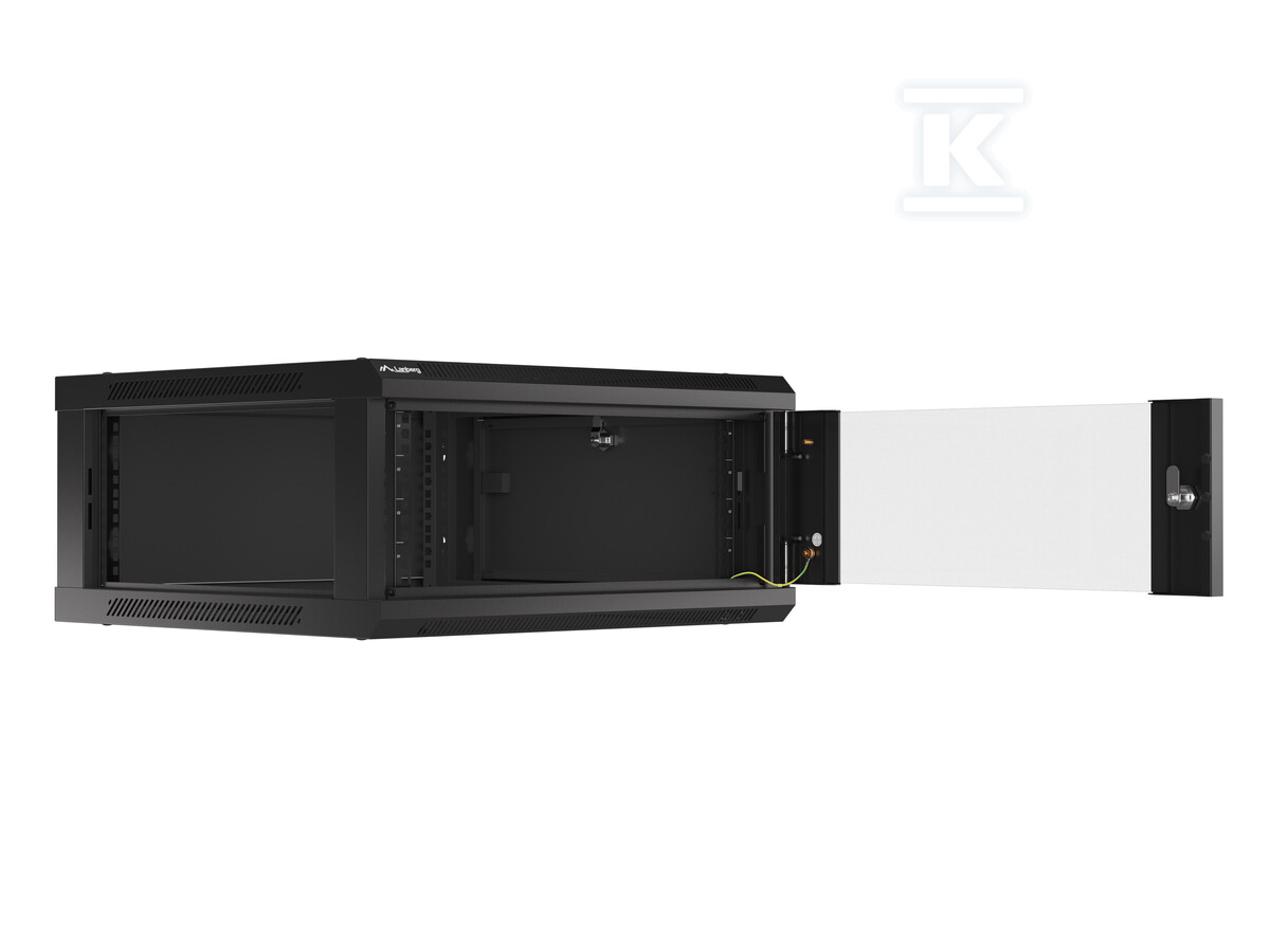 Шафа пропонує 4U висоти телеінформаційної ємності, що дозволяє монтувати обладнання стандартної висоти 19". Скляні передні двері забезпечують швидкий візуальний контроль стану обладнання всередині шафи. Доступ до внутрішнього простору захищений замком, що підвищує безпеку даних та обладнання. Отвори вентиляції у верхній панелі забезпечують належну циркуляцію повітря, запобігаючи перегріву обладнання. Максимальне статичне навантаження шафи становить 60 кг, що дозволяє безпечно зберігати сервери, комутатори та інше мережеве обладнання. Шафа відповідає стандартам ANSI/EIA RS-310-D, DIN 41491/PART 1, DIN 41494/PART 7, ETSI та IEC297-2:1982 – що гарантує сумісність з більшістю обладнання, доступного на ринку. Клас захисту IP20 забезпечує базовий захист від дотику та доступу до внутрішніх елементів.