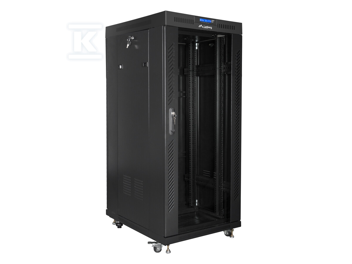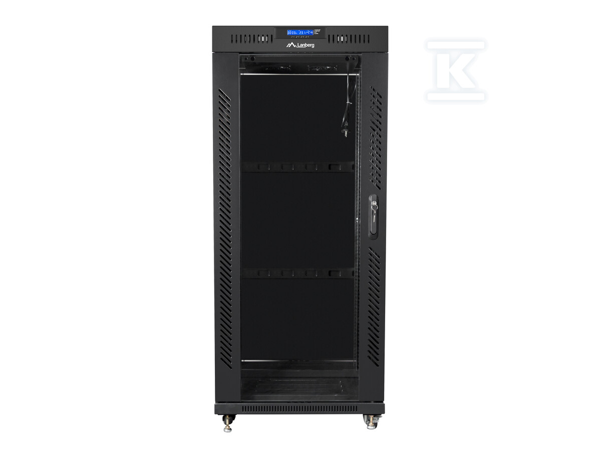 Шафа стійка 19" заввишки 27U, глибиною 800x1200 мм, була розроблена з урахуванням легкості монтажу. Завдяки продуманій конструкції типу flat pack транспорт простіший, а процес складання – швидкий та інтуїтивно зрозумілий. У комплекті є всі необхідні монтажні елементи, включаючи гвинти M6, коліщатка з гальмом та ніжки. Додатково шафа має вбудований LCD-панель з термостатом, годинником та можливістю ручного керування вентиляторами – що дозволяє точно керувати температурою всередині. Збільшена вантажопідйомність до 1200 кг, завдяки посиленій конструкції верхньої та нижньої кришки, рами та горизонтальних балок, дозволяє безпечно зберігати навіть важке обладнання.