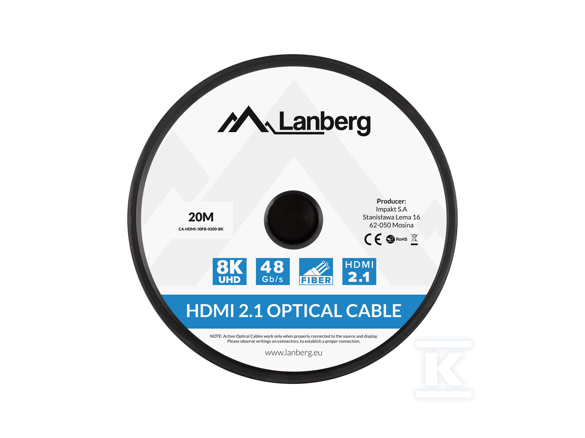 Довжина кабелю становить 20 метрів, підтримує стандарт HDMI 2.1 (Ultra High Speed), пропонує максимальну роздільну здатність 8K при 30 Гц або 10K з DSC та пропускну здатність на рівні 48 Гбіт/с. Виготовлений з міді (CU) та скляного волокна, має подвійне екранування та позолочені контакти, а обплетення дроту є пластиковим.