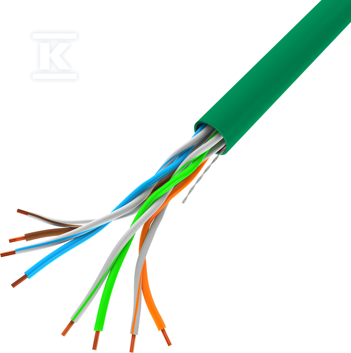 Кабель призначений для виготовлення патч-кордів максимальної довжини 10 метрів. Конструкція з дроту CCA (мідно-алюмінієвого сплаву) поєднує переваги обох матеріалів – провідність міді та легкість алюмінію, що полегшує встановлення. Жилки кабелю оточені ізоляцією HDPE, а вся конструкція захищена зовнішньою оболонкою PVC. Завдяки цьому кабель стійкий до механічних пошкоджень і забезпечує стабільну передачу даних. Друк лічильника довжини кожний метр полегшує точне відрізання необхідних відрізків кабелю під час встановлення.