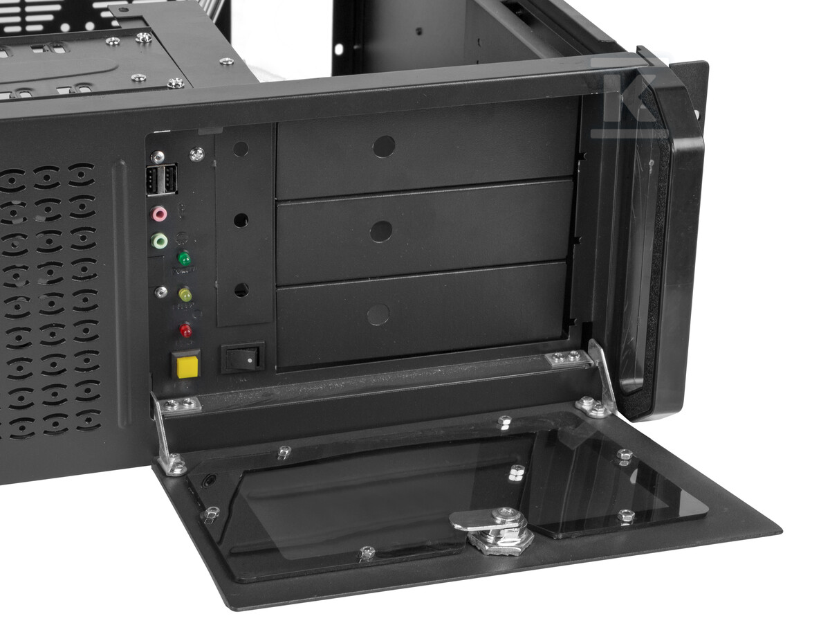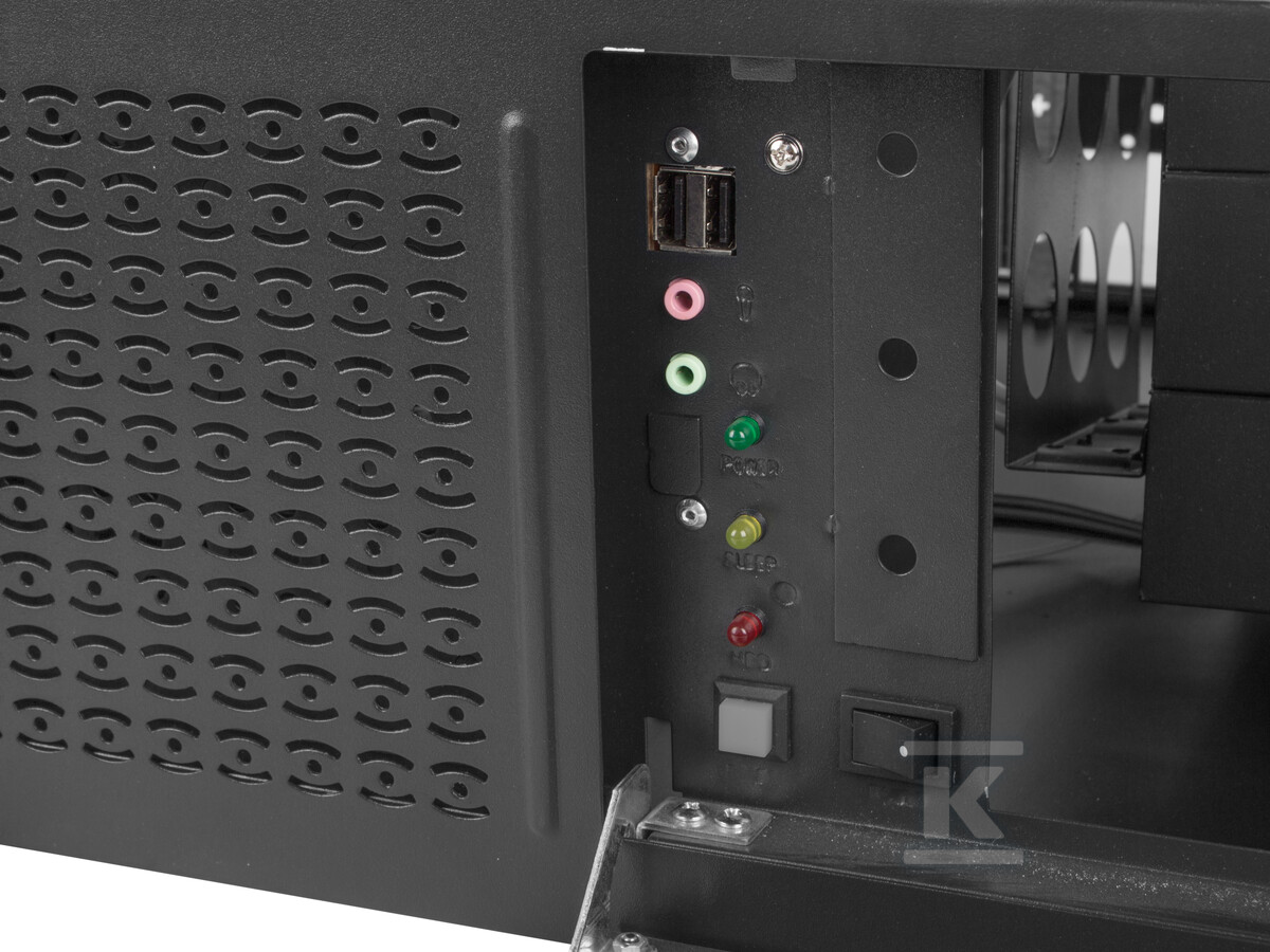 Система охолодження, заснована на двох вентиляторах 8x8 см, забезпечує оптимальну температуру роботи компонентів. Можливість монтажу додаткового вентилятора 12x12 см спереду та двох вентиляторів 8x8 см ззаду дозволяє адаптувати охолодження до специфічних потреб сервера. Змінний пиловий фільтр захищає внутрішню частину шафи від забруднень, а закрита передня панель (разом з ключами в комплекті) підвищує безпеку даних та компонентів. На передній панелі також розташовані порти USB 2.0 (2 шт.) та роз'єми mini jack 3.5 мм (2 шт.) для зручного підключення периферійних пристроїв. Світлодіод інформує про стан живлення, режим сну та активність жорсткого диска, полегшуючи моніторинг роботи системи.