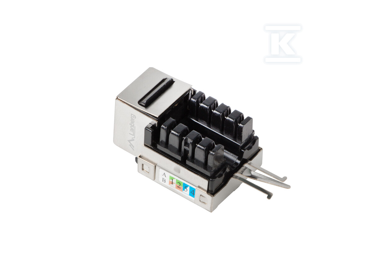 Корпус, виготовлений з металу, забезпечує довговічність та стійкість до механічних пошкоджень. Контакти, виготовлені з фосфорної бронзи, гарантують надійний контакт та тривалий термін служби гнізда – понад 750 циклів. Модуль екранований (S/FTP), що мінімізує електромагнітні перешкоди та забезпечує стабільну передачу даних. Приймає дроти діаметром від 22 до 26 AWG, що дає велику свободу вибору кабелів. Гніздо відповідає нормам EN 50173-1:2011, EN 60603-7-4 та ANSI/TIA 568-C.2, що підтверджує його високу якість та відповідність галузевим стандартам. Робота при температурі від -10°C до 60°C дозволяє використовувати його в різних умовах навколишнього середовища.
