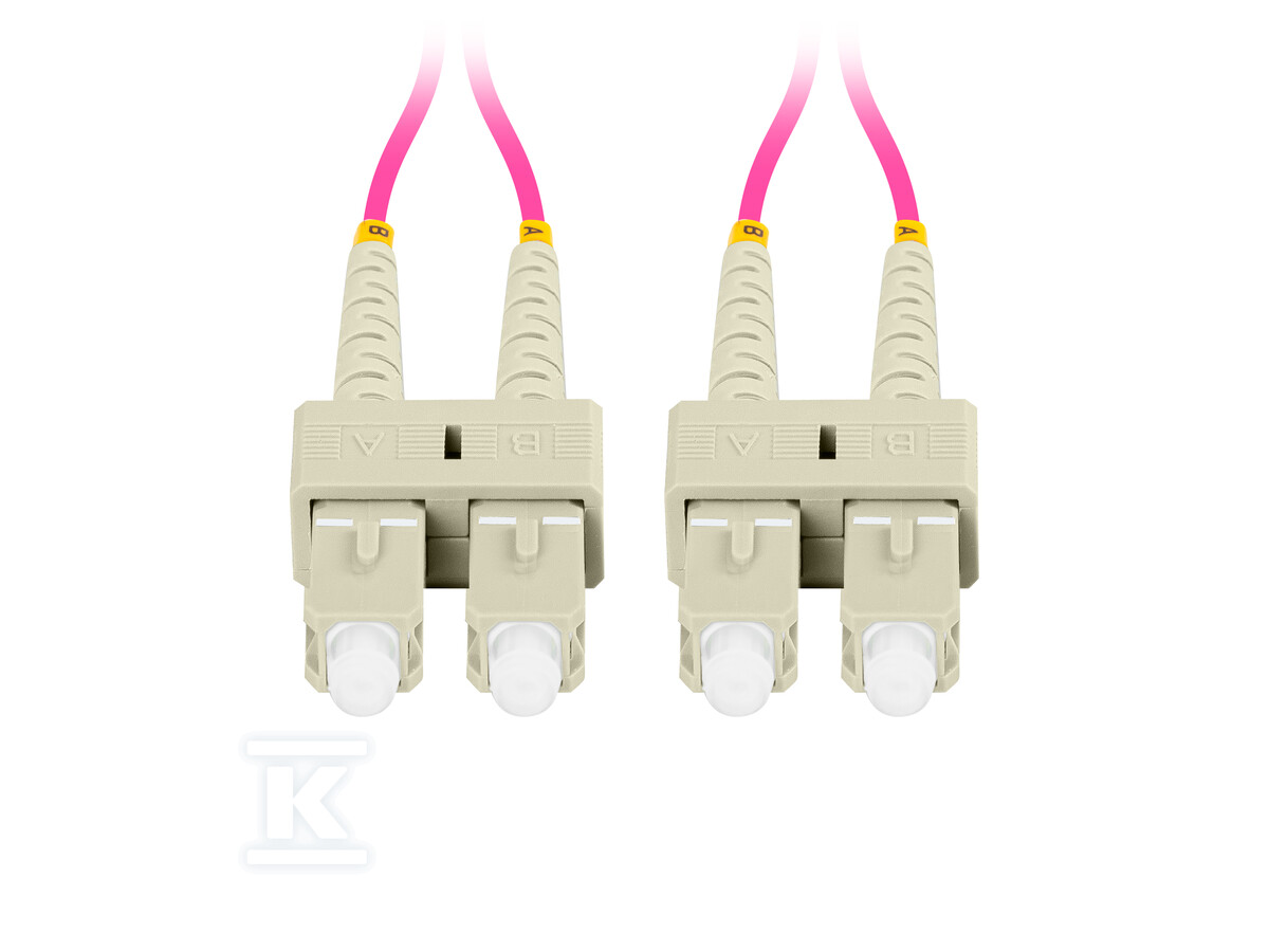 Патчкорд виготовлений з багатомодового волокна OM4 з діаметром 50/125 µm, що гарантує відмінні параметри передачі. З'єднання SC/UPC з поліруванням UPC забезпечують низькі втрати сигналу та високу надійність з'єднання. Покриття LSZH (Low Smoke Zero Halogen) мінімізує викид токсичних речовин у разі пожежі, підвищуючи безпеку установки. Діаметр кабелю 3.0 мм полегшує прокладку проводів і забезпечує зручність під час монтажу.