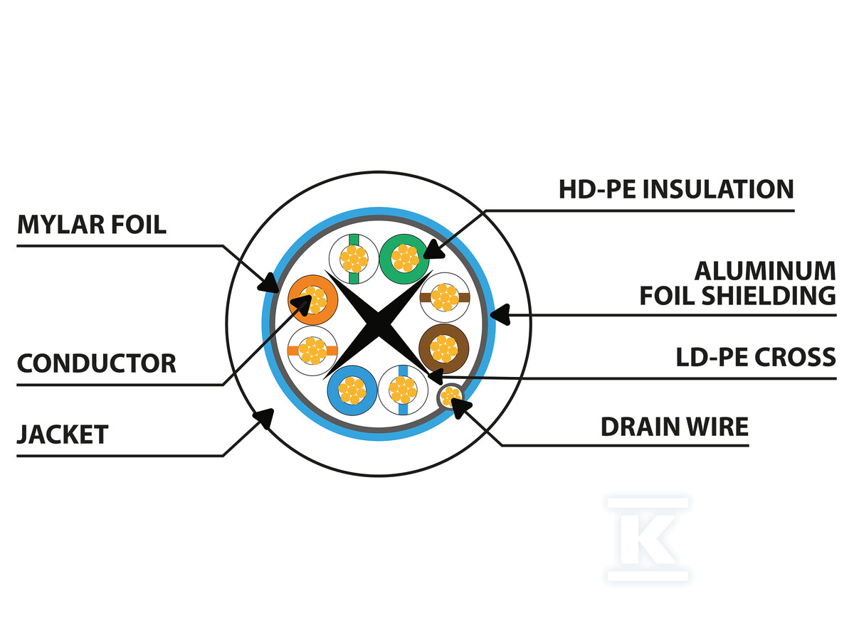 Патч-корд виготовлений з провідників CCA (Copper Clad Aluminum) та має оболонку PVC. Його зовнішній діаметр становить 5,7 мм, а товщина дроту - 26AWG (7 x 0,16 мм). Завдяки цьому він є гнучким і простим в установці, а водночас стійким до механічних пошкоджень. Провід працює з частотою до 250 МГц і забезпечує передачу даних зі швидкістю до 10 Гбіт/с.