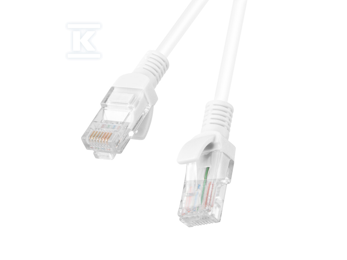 Патчкорд Lanberg PCU5-10CC-0050-W характеризується конструкцією U/UTP, що означає відсутність екранування. Виготовлений з провідників CCA (мідь, покрита алюмінієм) товщиною 26AWG (7 x 0,15 мм), що забезпечує відповідну гнучкість і міцність. Зовнішній діаметр кабелю становить близько 4,8 мм, а його оболонка виготовлена з PVC у білому кольорі (RAL9010). Довжина 0,5 метра робить його ідеальним для коротких з'єднань у шафах rack або біля пристроїв, розташованих близько один до одного.