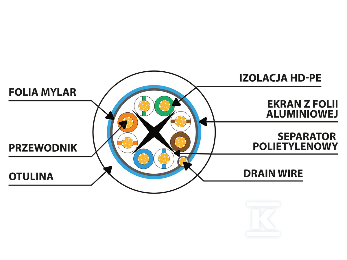 Кабель сірого кольору (RAL7035), що полегшує ідентифікацію в інсталяції. Підтримує частоту до 250MHz і пропускну здатність до 10 Гбіт/с, що дозволяє передавати великі обсяги даних без втрати якості.