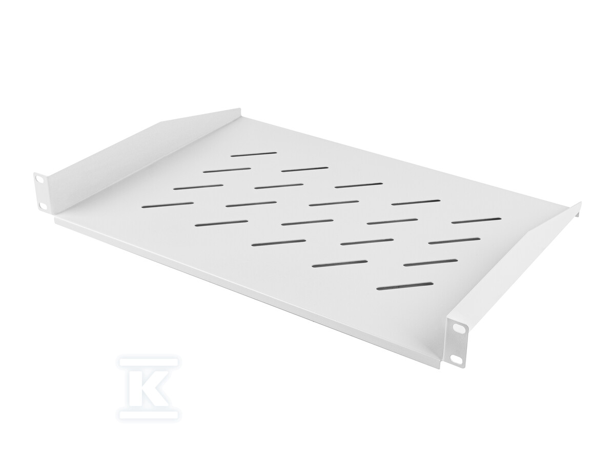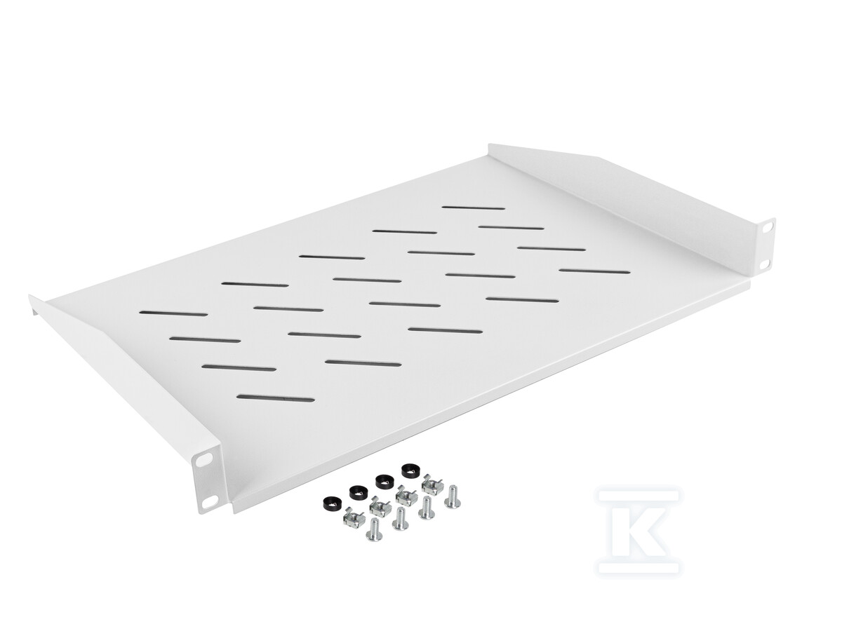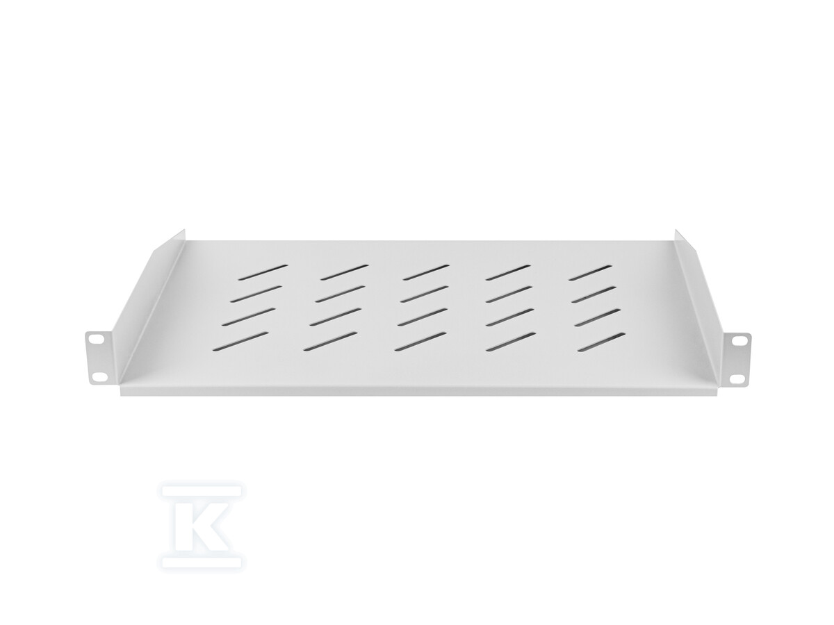 Полиця виготовлена з міцної сталі, пофарбованої порошковим методом у сірий колір (RAL 7035), що забезпечує її довговічність і стійкість до корозії. Монтаж здійснюється спереду за допомогою чотирьох точок кріплення, що полегшує встановлення та забезпечує стабільність. У комплекті є всі необхідні монтажні елементи, тому вам не потрібно нічого докуповувати. Перфорована конструкція полиці сприяє циркуляції повітря, що особливо важливо для пристроїв, що генерують тепло.
