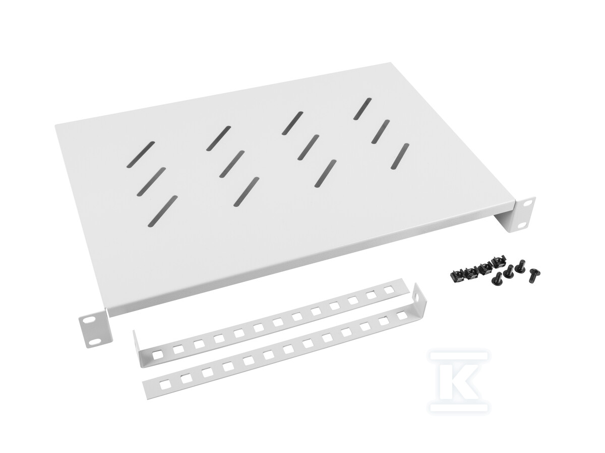 Полиця AK-1004-S характеризується легким монтажем за допомогою чотирьох точок кріплення. Завдяки цьому інсталяція швидка та інтуїтивно зрозуміла, заощаджуючи цінний час. Сірий колір полиці (RAL9004) пасує до більшості стандартних шаф rack, забезпечуючи естетичний вигляд. Вона підійде для зберігання блоків живлення, комутаторів, хабів чи інших мережевих аксесуарів.