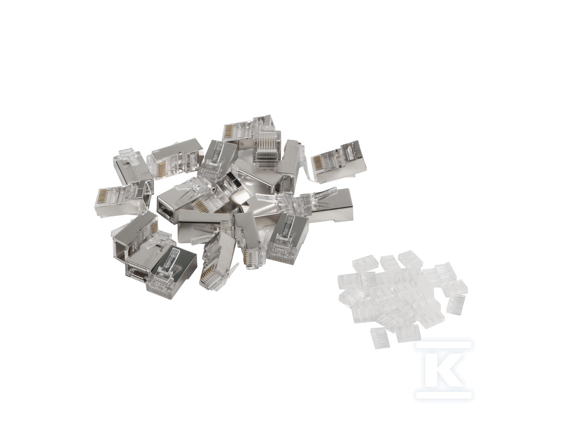 Цей набір складається з 20 екранованих мережевих роз'ємів RJ-45 (8P8C) категорії 6, призначених для кабелів LAN FTP. Це надійне рішення як для професійних інсталяторів, так і для кінцевих користувачів, які хочуть самостійно виконати міцні та надійні мережеві з'єднання. Ці роз'єми забезпечують стабільну передачу даних і мінімізують перешкоди, що є ключовим у сучасних комп'ютерних мережах.