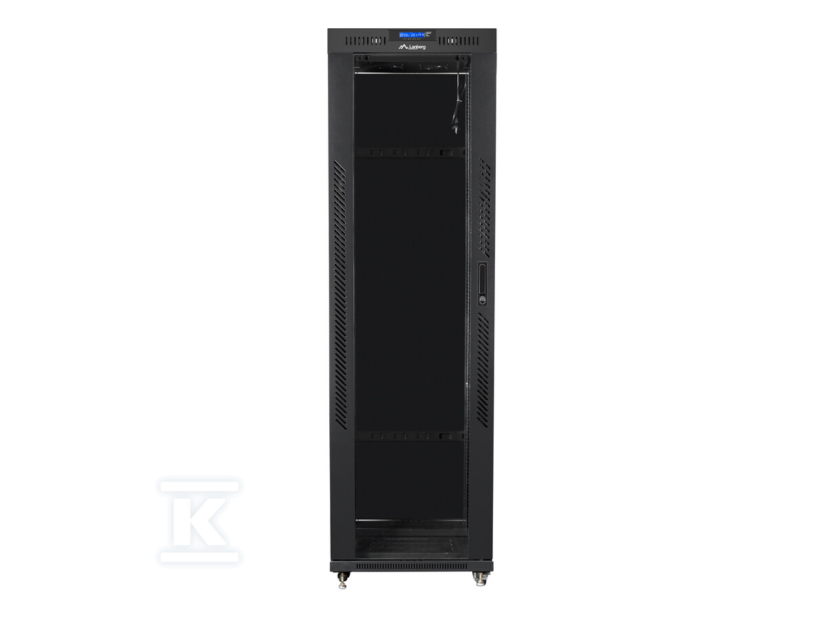 Вбудований РК-панель з термостатом дозволяє контролювати температуру всередині стелажу та керувати роботою вентиляторів. Завдяки цьому можна забезпечити оптимальні умови роботи для чутливих пристроїв. Стельовий вентиляційний панель, оснащений 4 вентиляторами, забезпечує ефективне охолодження, а можливість регулювання швидкості обертання дозволяє адаптувати потік повітря до поточних потреб. Стелаж сумісний зі стандартами ANSI/EIA RS-310-D, DIN 41491/PART 1, DIN 41494/PART 7, ETSI та IEC297-2:1982, що забезпечує сумісність з більшістю rack-обладнання, доступного на ринку. Колеса з гальмами та регульовані ніжки полегшують переміщення та стабілізацію стелажу.