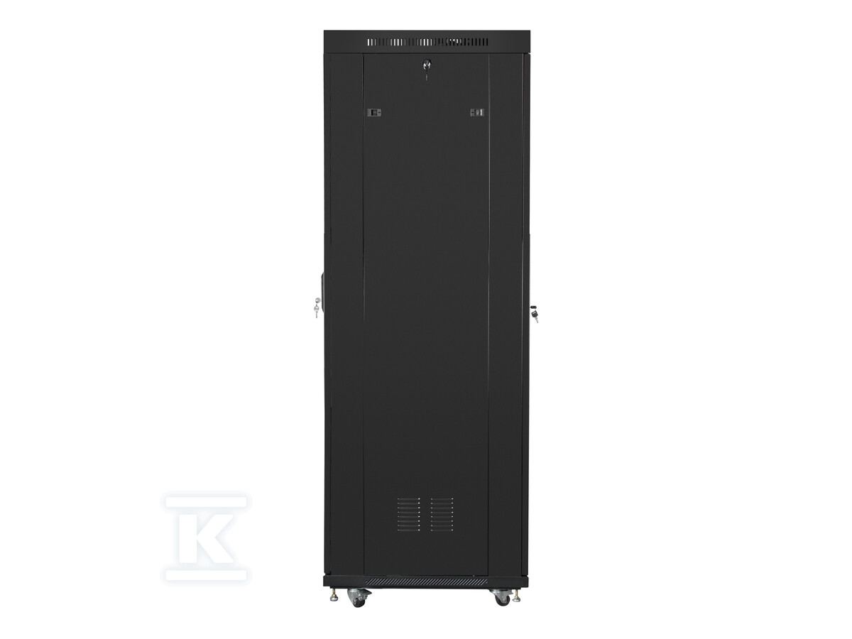 Виготовлена з високоякісної холоднокатаної сталі, стелаж характеризується міцністю та точністю виготовлення. Передні двері з гартованого скла не тільки забезпечують швидкий огляд внутрішнього простору, але й гарантують безпеку обладнання. Замок на передніх та задніх сталевих дверях, а також бічні панелі із замками, захищають від несанкціонованого доступу. Додатково, стелаж має заземлення на передніх, задніх дверях та рамі, що мінімізує ризик пошкоджень, спричинених перенапругою. Збільшена вантажопідйомність до 1200 кг дозволяє встановлювати навіть важке серверне обладнання.