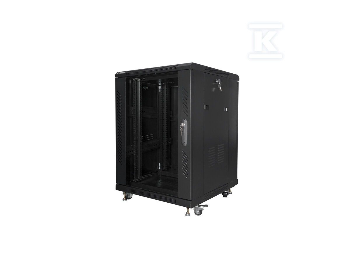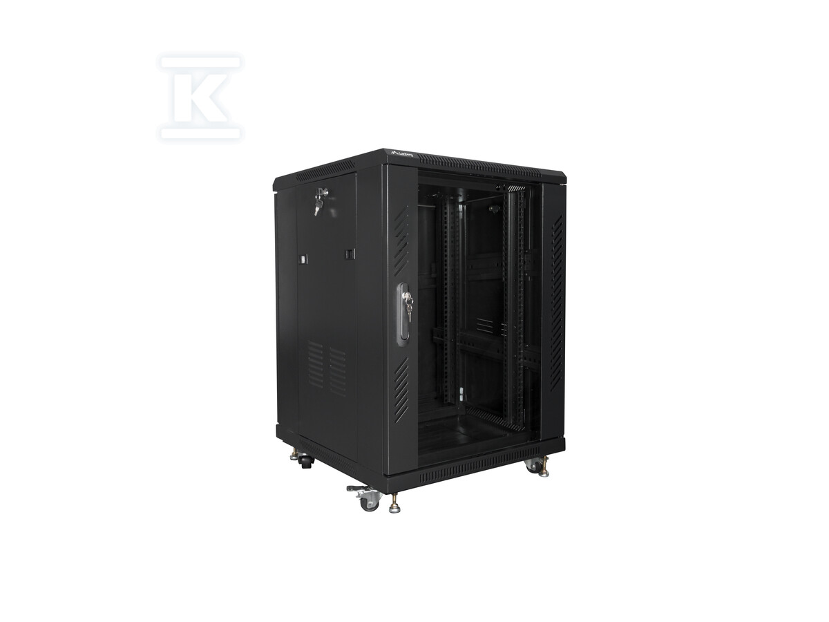 У комплекті з шафою ви знайдете все, що потрібно для її правильного монтажу та використання: коліщатка з гальмом, регульовані ніжки, гвинти M6, замки до передніх і задніх дверей та бічних панелей, а також аксесуари для кріплення несучих рейок. Максимальне статичне навантаження шафи становить 800 кг. Зовнішні розміри: 600 мм (ширина) x 600 мм (глибина) x 848 мм (висота).