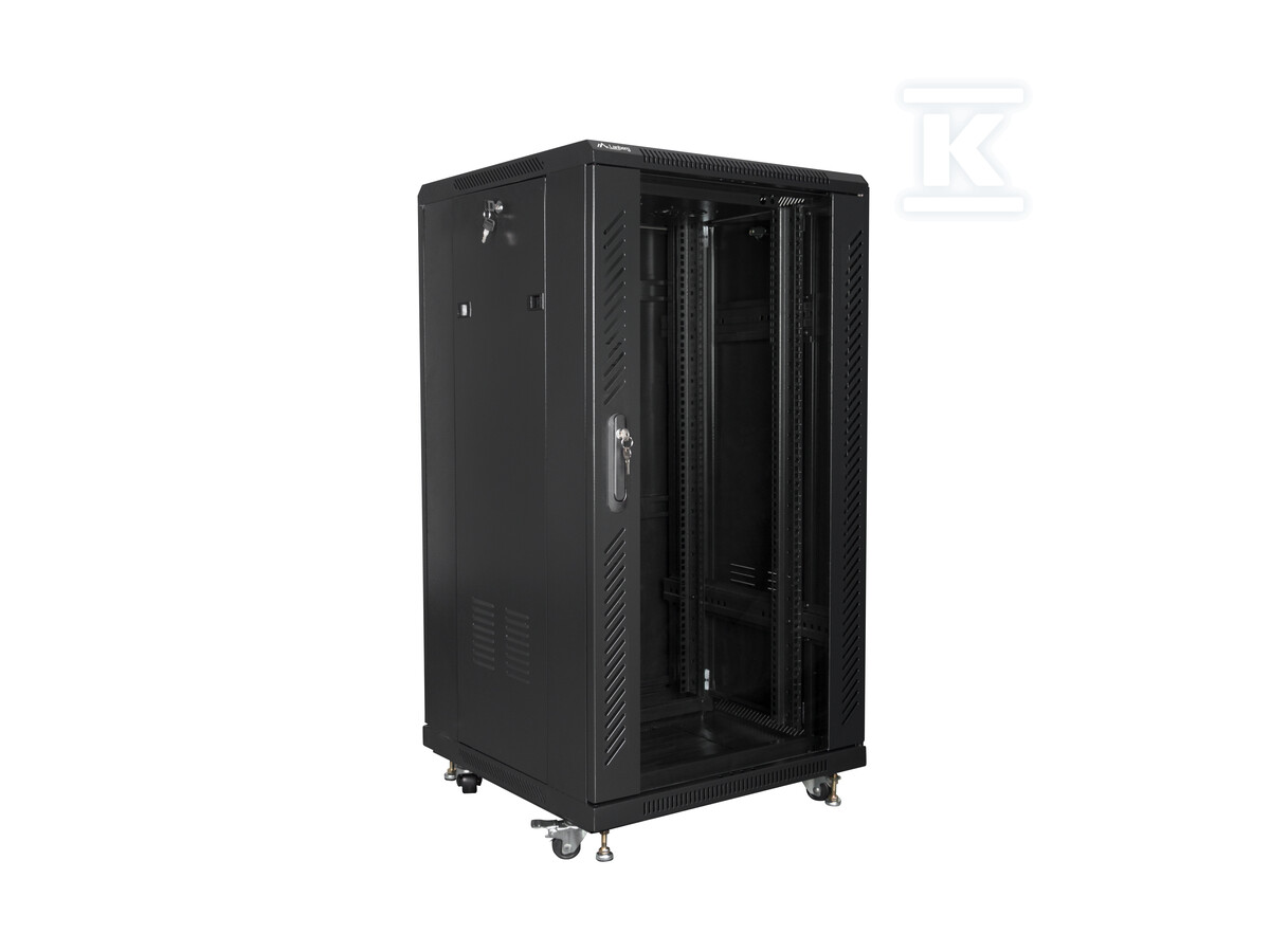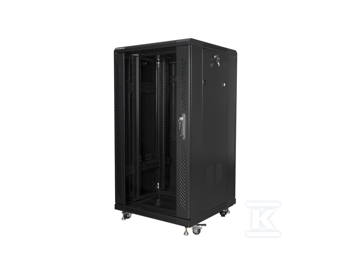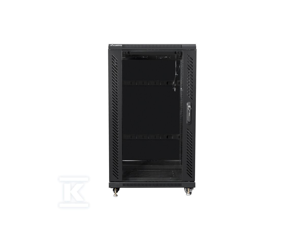 Шафа пропонує 22U телеінформаційної висоти, що дозволяє монтувати велику кількість пристроїв 19". Виготовлена з високоякісної холоднокатаної сталі, забезпечує стабільність і стійкість до навантажень – максимальне статичне навантаження становить аж 800 кг. Засклені передні двері дозволяють швидко візуально контролювати стан обладнання, а металеві задні двері забезпечують додаткову безпеку. Передні двері оснащені замком, що захищає від несанкціонованого доступу. Додатково, шафа має заземлення для підвищення безпеки використання.