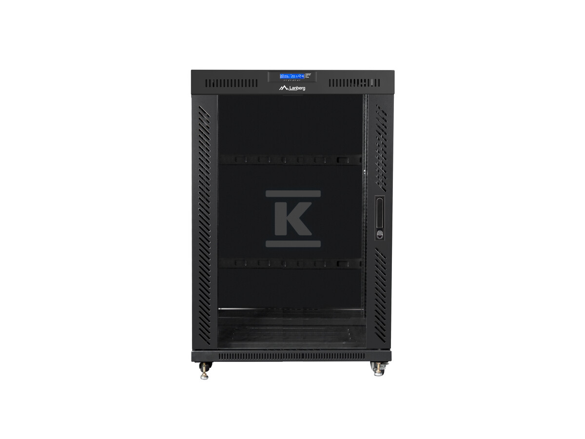 Шафа виготовлена з високоякісної холоднокатаної сталі, що гарантує її довговічність та стійкість до навантажень. Збільшена вантажопідйомність – до 1200 кг – дозволяє безпечно розмістити навіть важке серверне обладнання. РК-дисплей з термостатом та годинником дозволяє контролювати умови всередині шафи та ручне керування вентиляторами. Скляні передні двері забезпечують легкий доступ до пристроїв, а металеві задні двері підвищують безпеку. Додатково, шафа має вентиляційний отвір у верхній частині конструкції, що сприяє ефективному охолодженню компонентів. Передній замок, а також бічні та задні замки забезпечують безпеку зберігання обладнання.