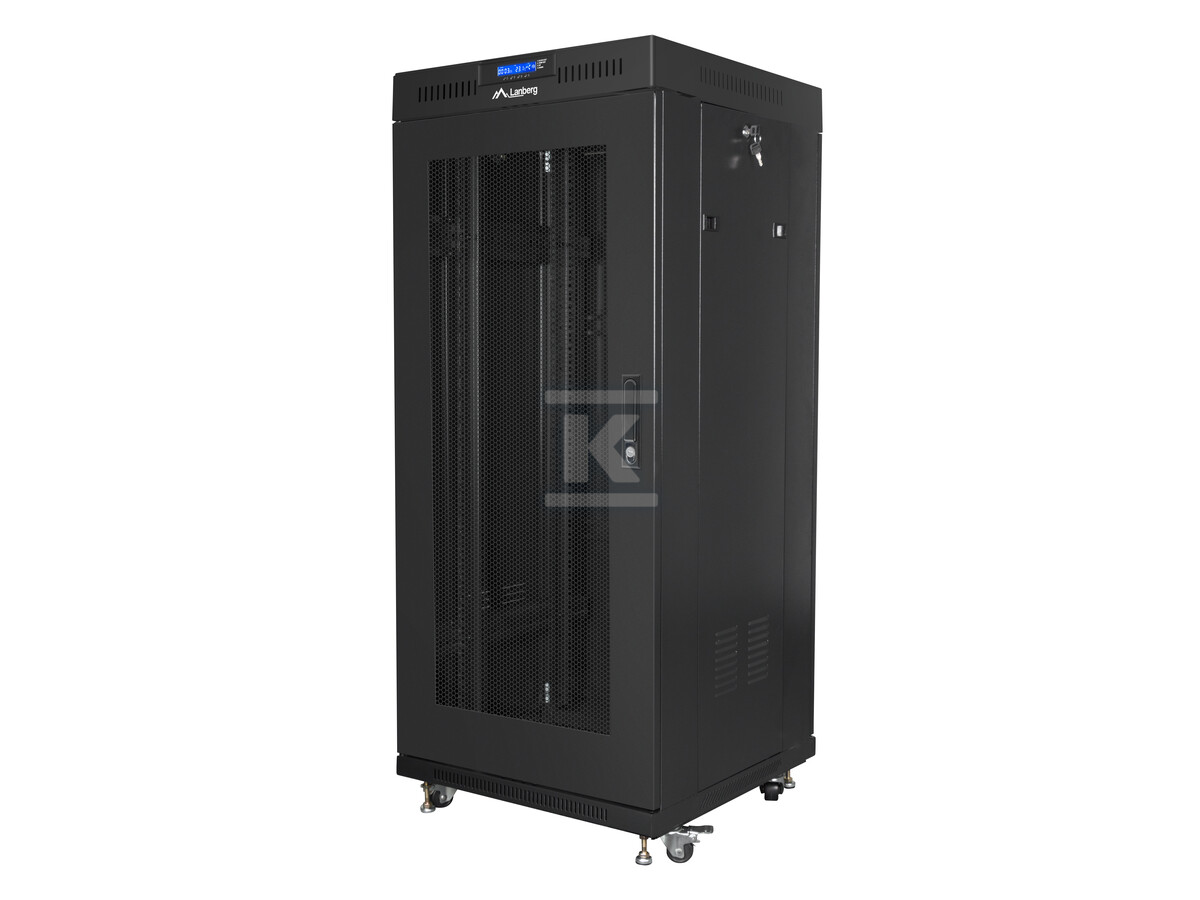 Шафа розроблена з урахуванням зручності монтажу та подальшої експлуатації. Регульовані монтажні шини дозволяють адаптувати її до різноманітного обладнання, а перфоровані передні та задні двері забезпечують належну циркуляцію повітря. Додатково, шафа оснащена LCD-дисплеєм з термостатом, який в режимі реального часу інформує про температуру всередині та статус вентиляторів. Можливість монтажу дверей з правого або лівого боку та знімні бічні панелі полегшують доступ до внутрішнього простору шафи під час обслуговування.