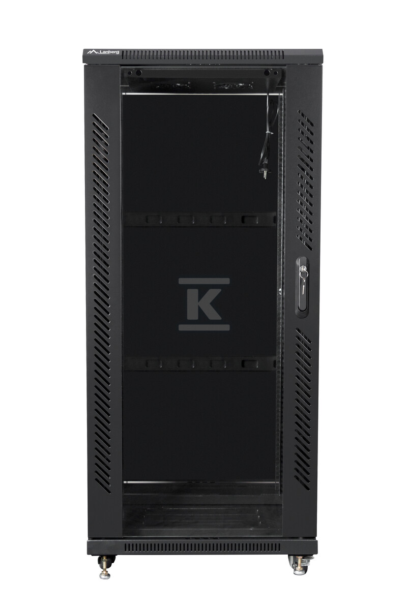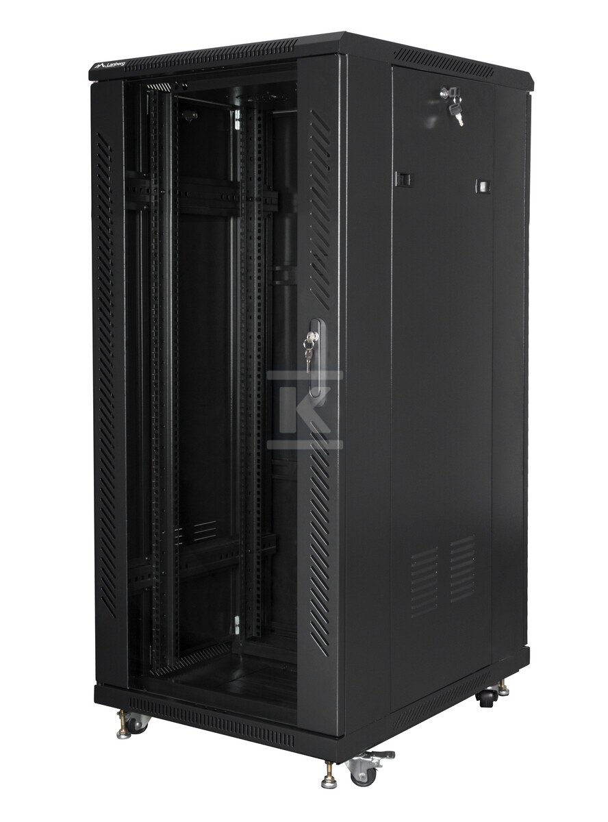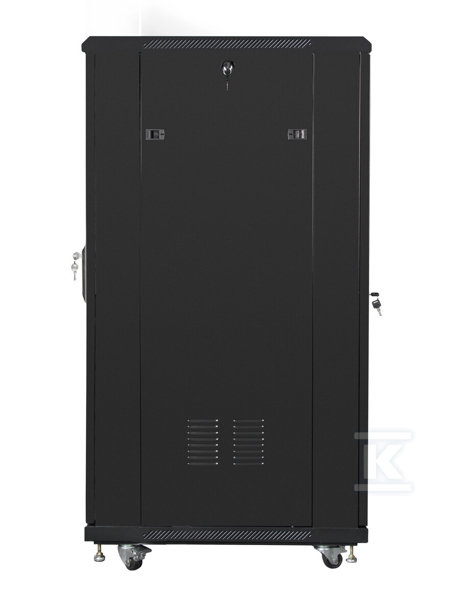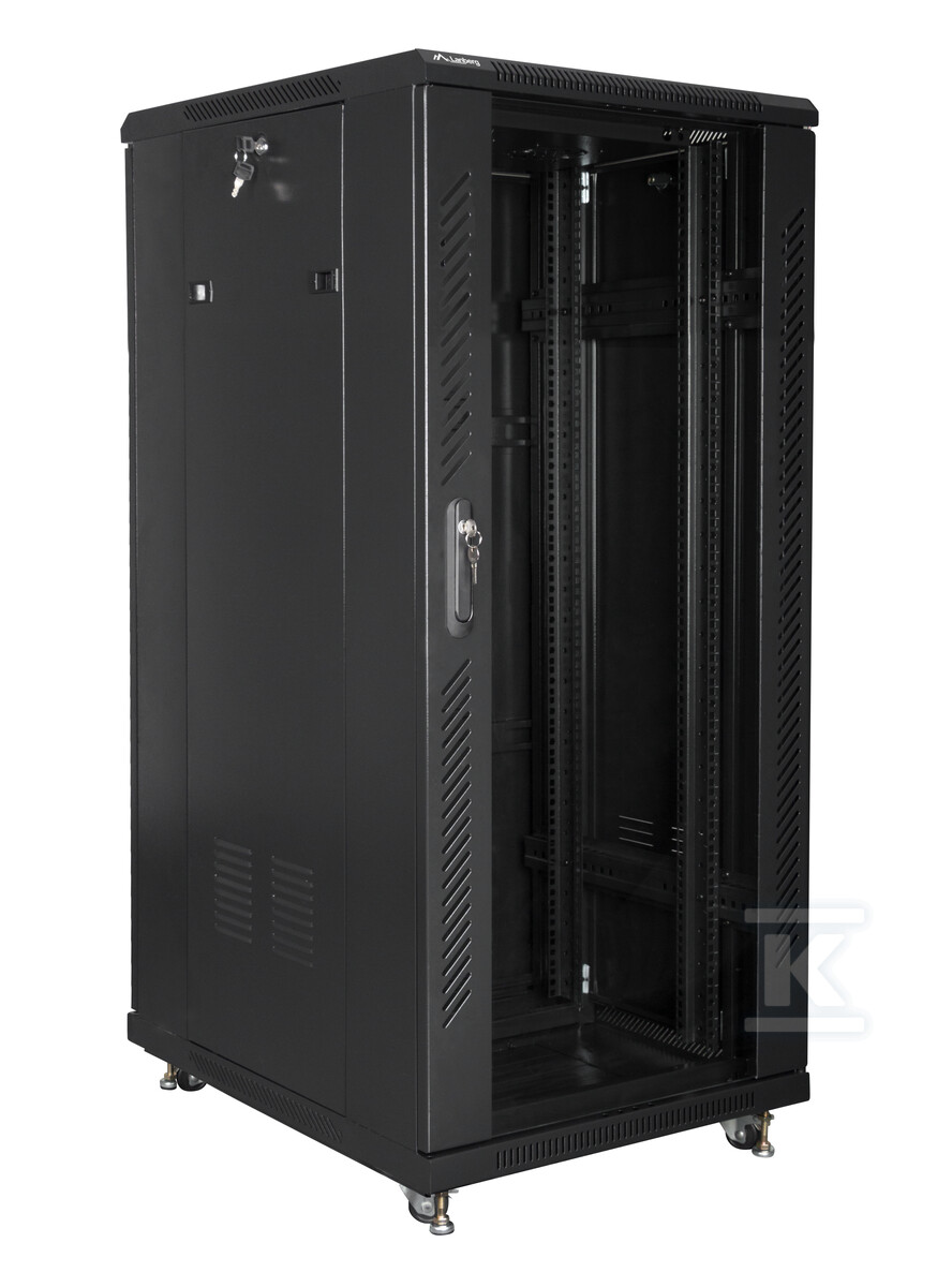 Шафа розроблена з урахуванням легкості монтажу – поставляється у формі flat pack, що полегшує транспортування та дозволяє самостійно зібрати. Міцна конструкція, заснована на сталевих профілях, забезпечує вантажопідйомність до 800 кг, що дозволяє встановлювати навіть важке обладнання. Передні двері, виготовлені з гартованого скла, забезпечують хорошу видимість внутрішнього простору, а можливість їх відкриття під кутом 215° полегшує доступ до пристроїв. Задні двері з металу додатково захищають вміст шафи. Чотири коліщатка з гальмами дозволяють легко переміщати шафу, а регульовані монтажні рейки дозволяють налаштувати конфігурацію відповідно до індивідуальних потреб. Крім того, шафа має вентиляційні отвори у верхній частині та чотири вбудовані вентилятори 230V, забезпечуючи оптимальне охолодження встановленого обладнання.