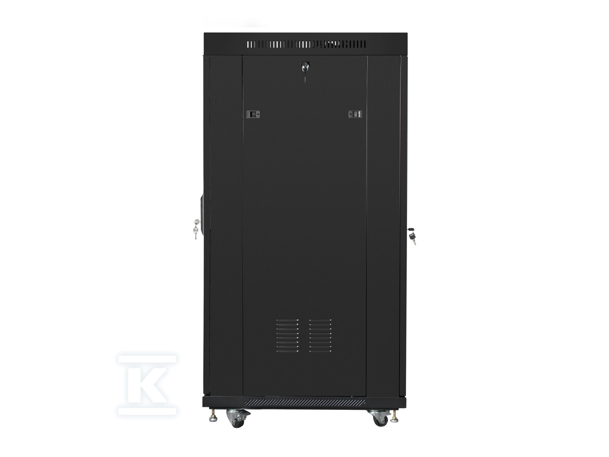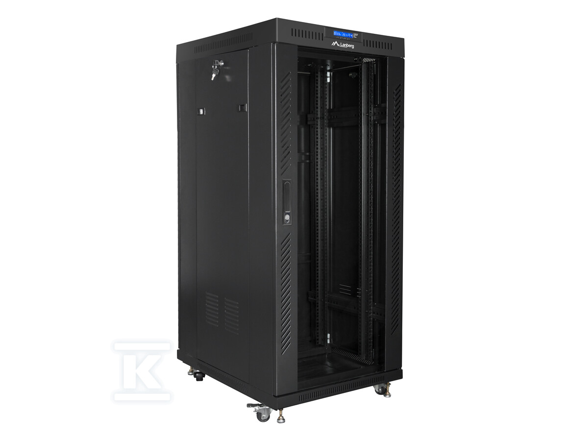 Шафа оснащена низкою зручностей, які полегшують монтаж, управління та охолодження обладнання. Засклені передні двері дозволяють швидко переглянути вміст без необхідності відкривання шафи. Інтегрований РК-панель з термостатом дозволяє контролювати температуру всередині та керувати роботою вентиляторів. Додатково, шафа має вентиляційний отвір у верхній частині, що забезпечує оптимальний потік повітря. Завдяки цьому підтримання відповідної температури роботи пристроїв є простим та ефективним.