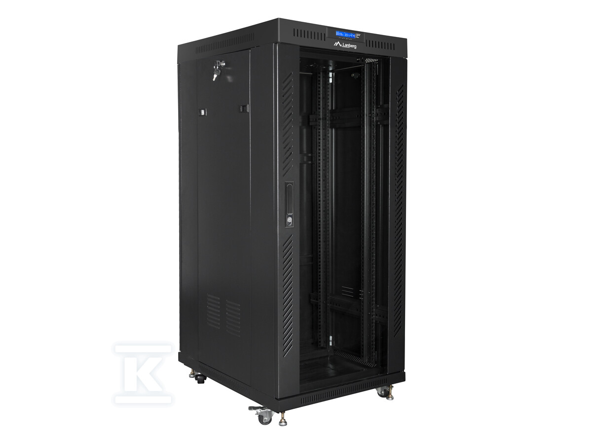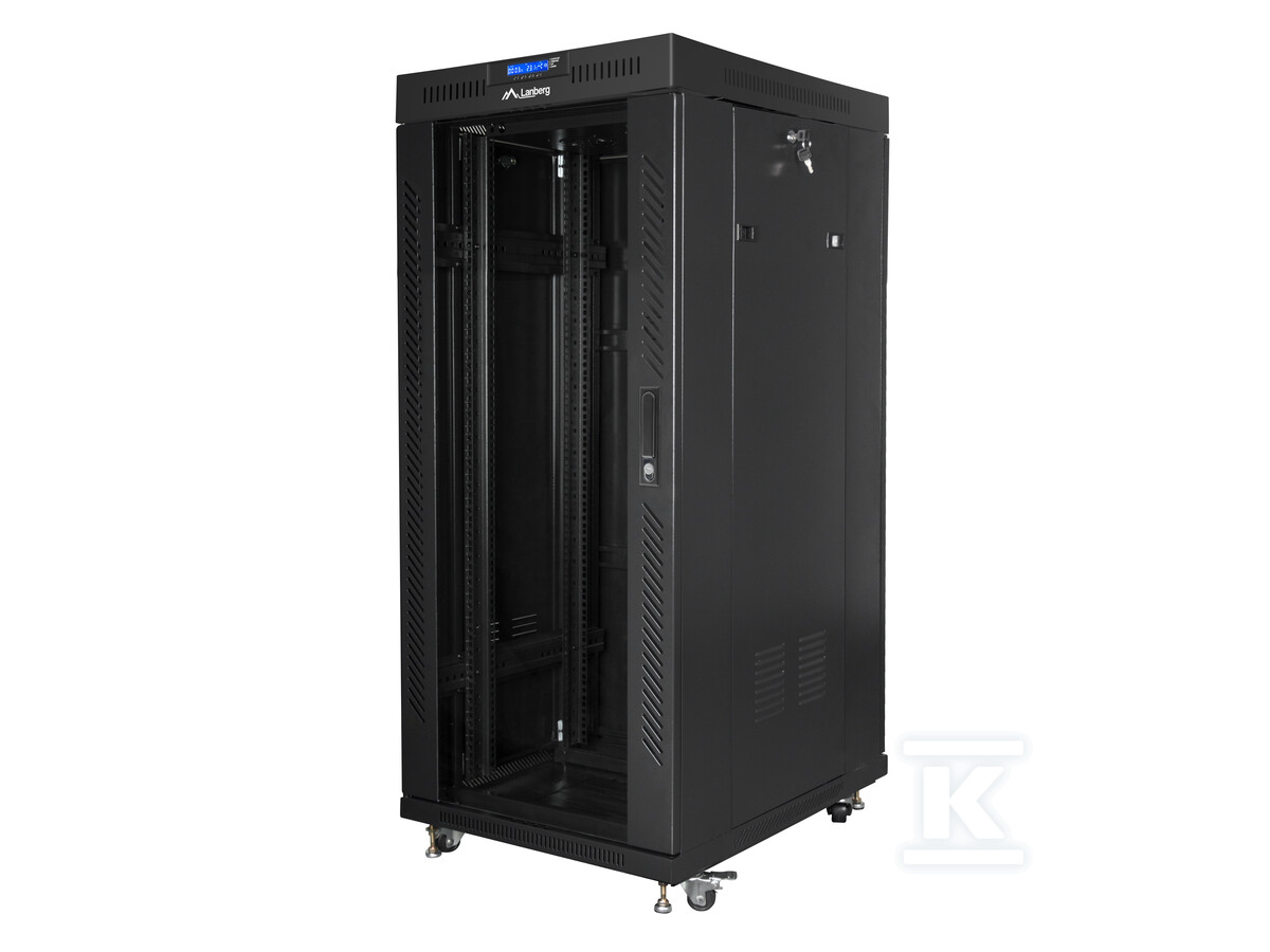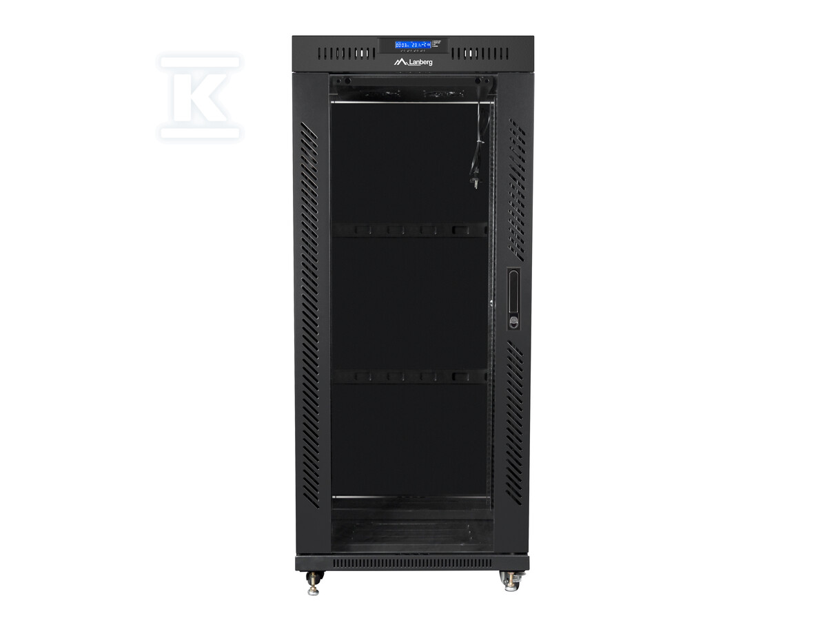 Перфоровані передні двері дозволяють легко візуально контролювати обладнання, розміщене всередині, а металеві задні двері забезпечують додаткову безпеку. У комплекті є коліщатка з гальмом, що полегшує переміщення шафи, та регульовані ніжки, що дозволяють стабільно встановити її на нерівних поверхнях. Вбудований РК-панель з термостатом дозволяє контролювати температуру всередині шафи та ручне керування вентиляторами, що сприяє оптимальним умовам роботи для обладнання. Шафа також має аж 6 місць для вентиляторів, забезпечуючи ефективне охолодження.
