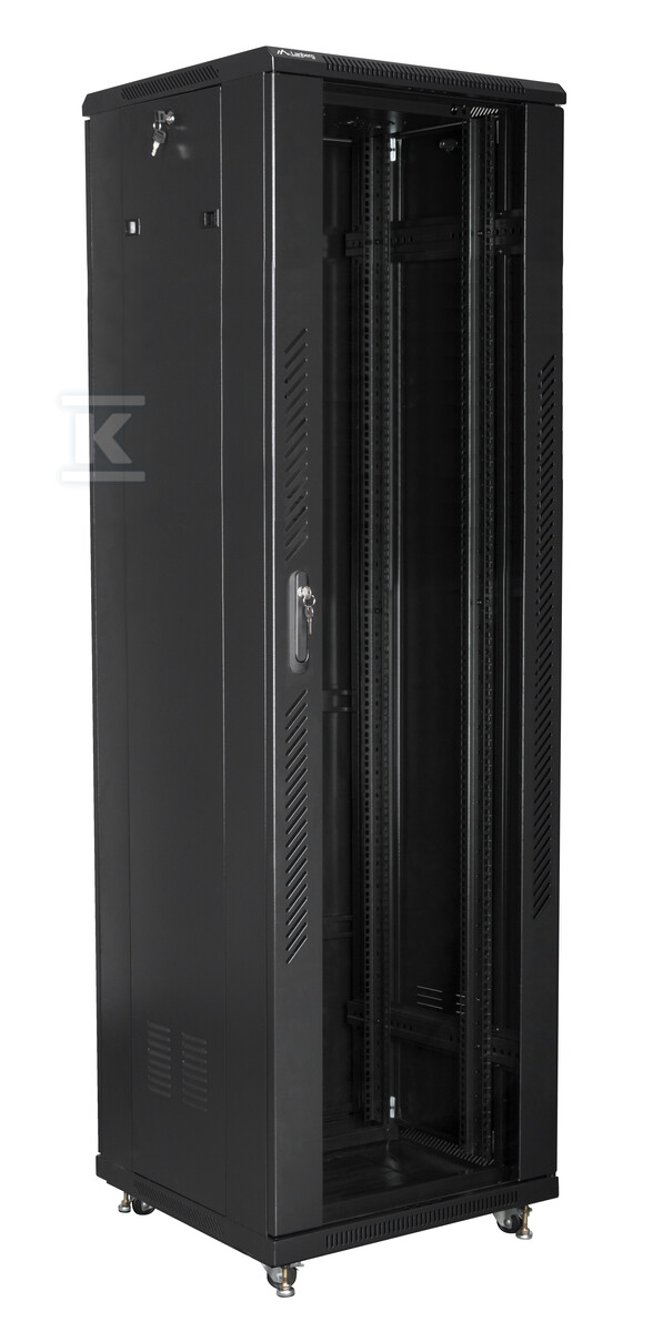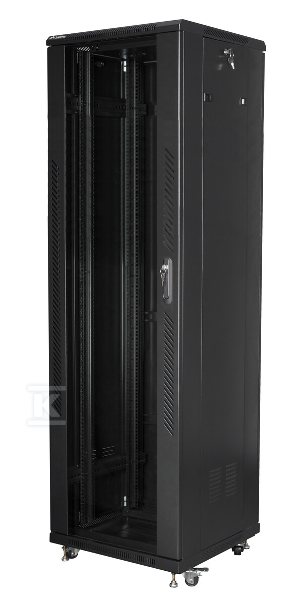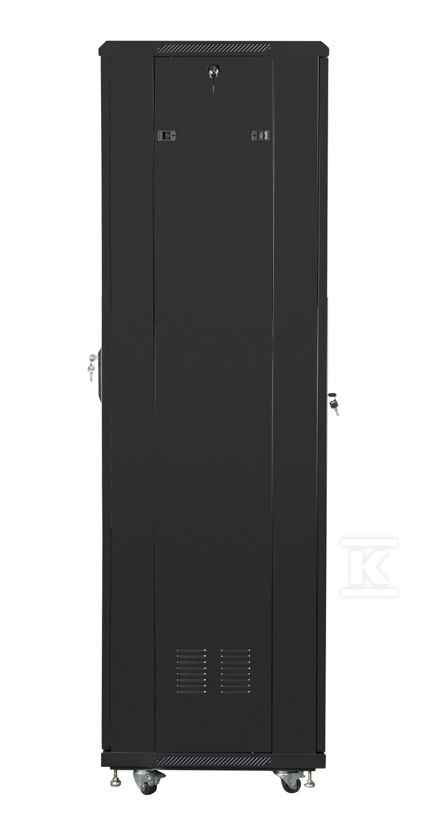 Безпека обладнання є пріоритетом – шафа оснащена передніми дверцятами з гартованого скла із замком та металевими задніми дверцятами із замком. Бічні панелі також мають можливість замикання на ключ. Ефективний потік повітря забезпечується вентиляційним отвором у верхній частині конструкції та можливістю монтажу двох вентиляторів (у комплекті), що допомагає підтримувати оптимальну температуру роботи серверного обладнання. Шафа відповідає нормам ANSI/EIA RS-310-D, DIN 41491/PART 1, DIN 41494/PART 7, ETSI та IEC297-2:1982, що підтверджує її високу якість і відповідність галузевим стандартам. Максимальне статичне навантаження шафи становить 800 кг, що дозволяє встановлювати навіть важке обладнання.