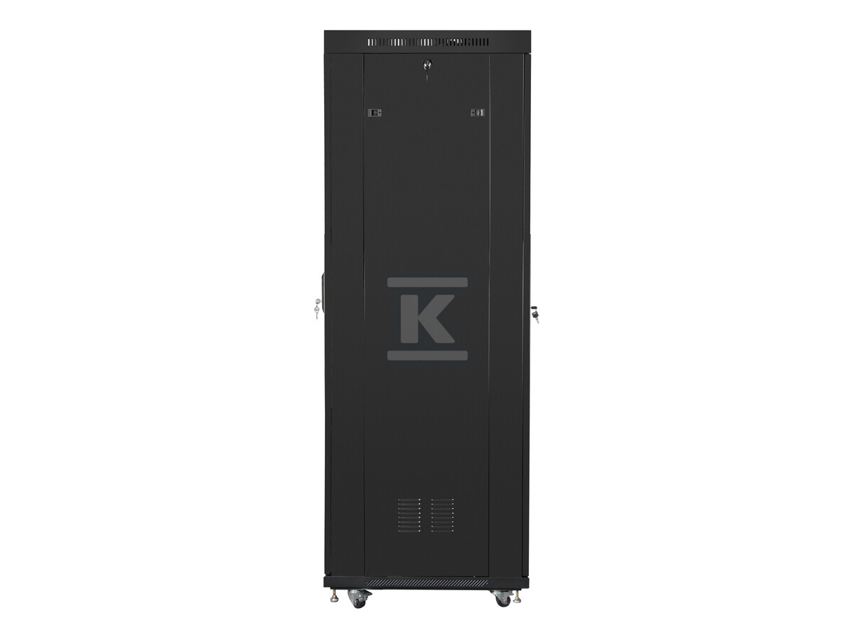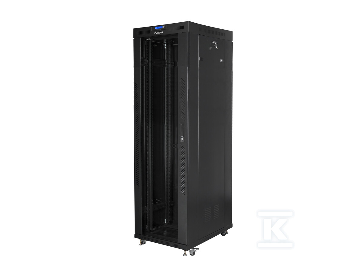 У стандартному обладнанні ви також знайдете цифровий термостат LCD, який контролює температуру всередині шафи, та вентиляційний панель з чотирма вентиляторами 230V, забезпечуючи ефективне охолодження навіть у вимогливих умовах. Два вертикальні організатори кабелів допомагають підтримувати порядок і полегшують управління кабелями. Комплект також містить замки для передніх, задніх дверей та бічних панелей для додаткової безпеки.