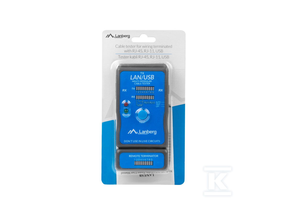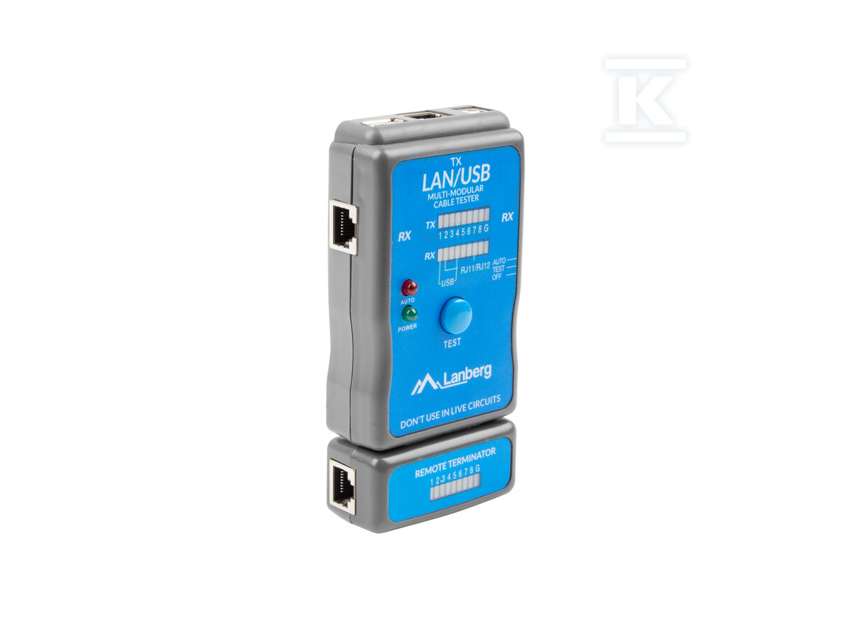 Цей компактний тестер дозволяє швидко та ефективно перевіряти справність мережевих кабелів RJ45, телефонних RJ11/RJ12 та USB кабелів. Пристрій незамінний як для професійних інсталяторів, так і для кінцевих користувачів, які хочуть самостійно перевірити правильність прокладання кабелів. Тестер дозволяє ідентифікувати пошкодження, обриви в ланцюзі та помилки в укладанні кабелів, що забезпечує стабільні та надійні мережеві та data-з'єднання.