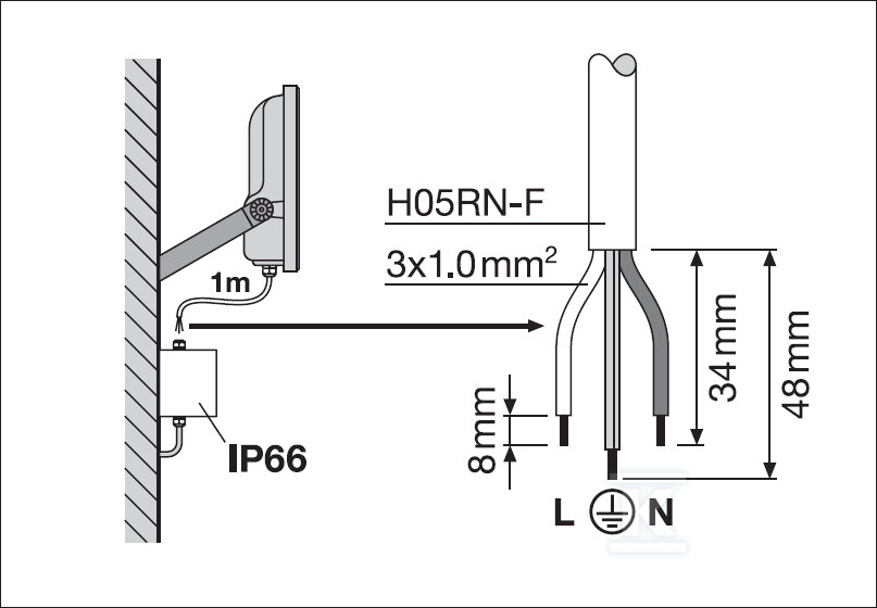 Прожектор виготовлений з міцного алюмінію, що забезпечує його довговічність та стійкість до корозії. Розсіювач з матового загартованого скла забезпечує безпечне та рівномірне розсіювання світла. Заводський кабель довжиною 1 метр (H05RN-F, 3 x 1,0 мм²) полегшує встановлення. Кріпильні затискачі з кутом 30° та широким діапазоном обертання дозволяють точно налаштувати кут падіння світла. Відвідний клапан оптимізує обмін повітря всередині корпусу, запобігаючи конденсації вологи без зниження ступеня захисту IP66.