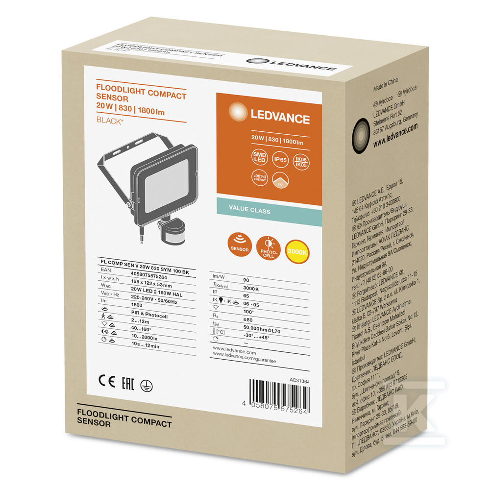 Прожектор LED FLOOD COMPACT 20W 830 IP65 Симетричний 100º Датчик руху та світла - LEDVANCE 4058075575264