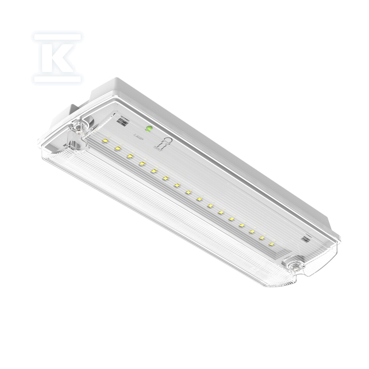 Вбудований акумулятор дозволяє автономно працювати протягом мінімум 3 годин у разі відключення електроенергії. Він має піктограму, що вказує шлях евакуації, що полегшує орієнтацію в надзвичайній ситуації. Завдяки використанню світлодіодів з колірною температурою 5700K, світильник випромінює яскраве, холодне світло зі світловим потоком 200 lm, забезпечуючи хорошу видимість. Кут розсіювання світла становить 100° x 120°, що оптимізує освітлення простору.