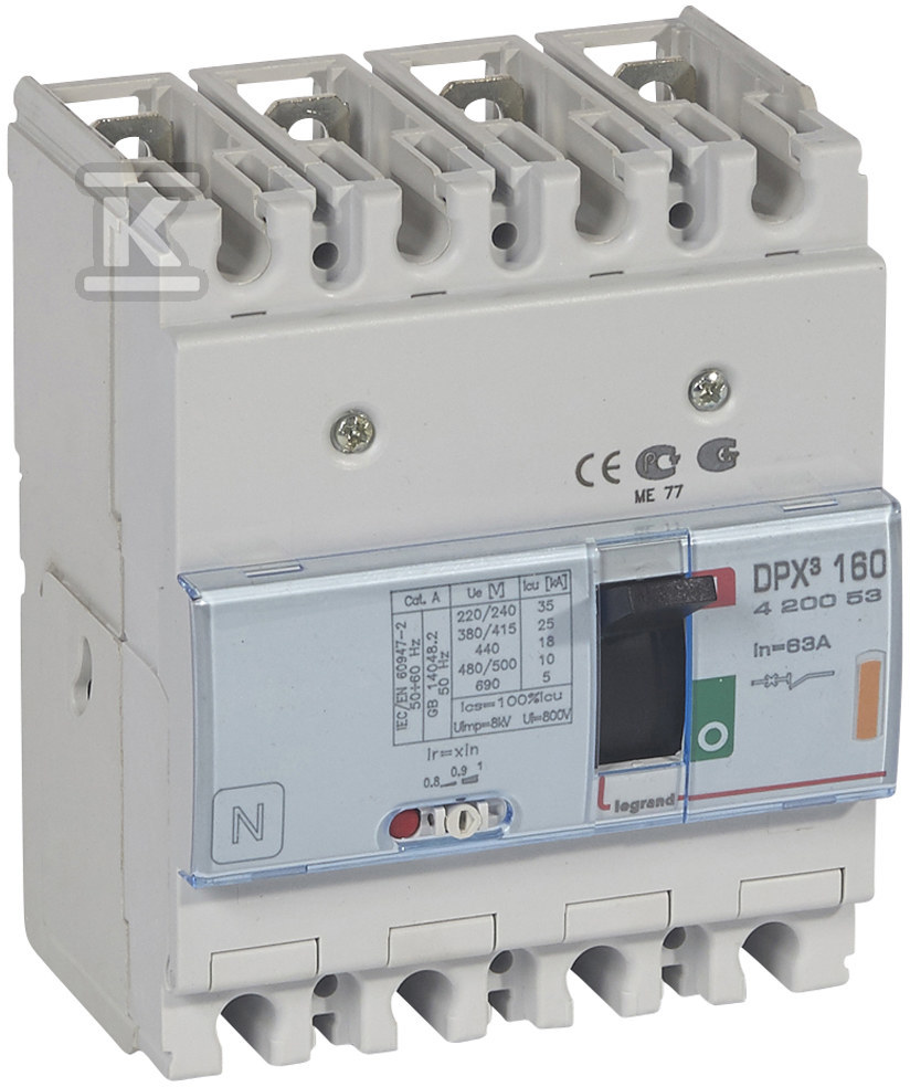Вимикач DPX³ 160 характеризується міцною конструкцією та монтажем на шину TH, що полегшує його встановлення та заміну. Він має вбудований теплово-магнітний вимикач з регулюванням у діапазоні 50.4 - 63A, що дозволяє точно налаштувати його відповідно до специфіки захищеної інсталяції. Крім того, наявність вимикача зниженої напруги збільшує функціональність пристрою, забезпечуючи додатковий рівень захисту. Чотири полюси (4P) роблять його придатним для захисту трифазних ланцюгів, а також однофазних з поверненням до землі (TT). Вимикач має гвинтові з'єднання, які забезпечують надійне та довговічне з'єднання проводів. Індикатор вимкнення дозволяє швидко ідентифікувати стан пристрою після спрацювання захисту.