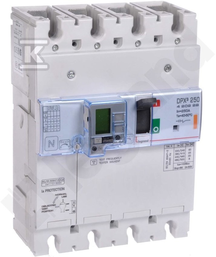 Вимикач потужності з теплово-магнітним вивільнювачем з вбудованим диференціальним захистом DPX3 250+BL.R 4P 250A 25kA 420229